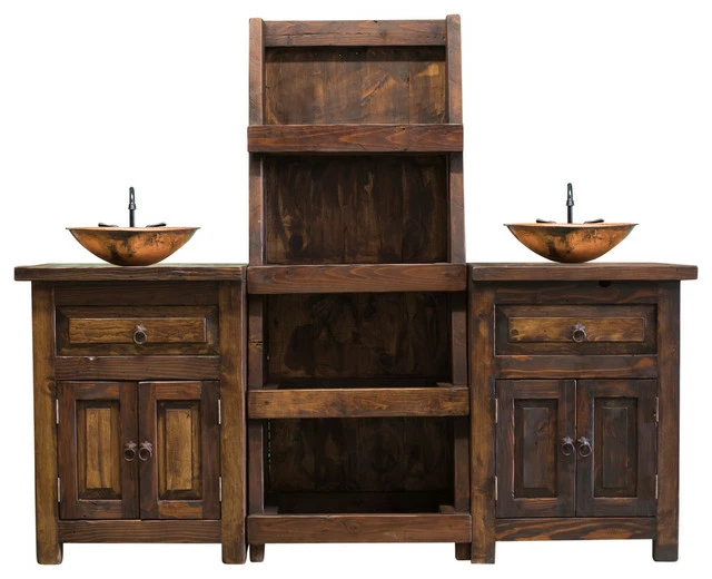 Gorgeous aesthetics? Storage? This vanity has it all! Our Emmett Double sink vanity is crafted from solid reclaimed wood and features a multi-process paste wax finish. The top drawers on the left and right sides are false to allow for plumbing. The center tower offers ample space for items as well as the cabinets underneath. This beautiful vanity is built in 3 separate pieces so the side vanities can be spaced to accommodate your plumbing and the free standing center shelf can be placed in the center, or anywhere in the bathroom!