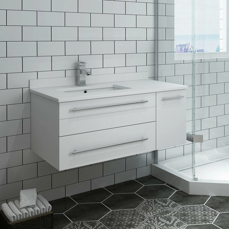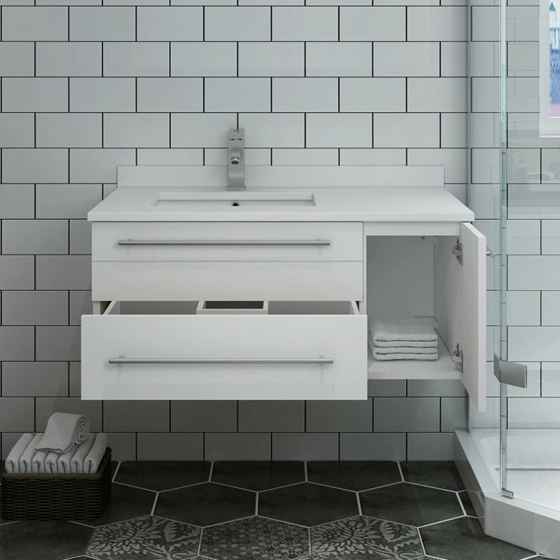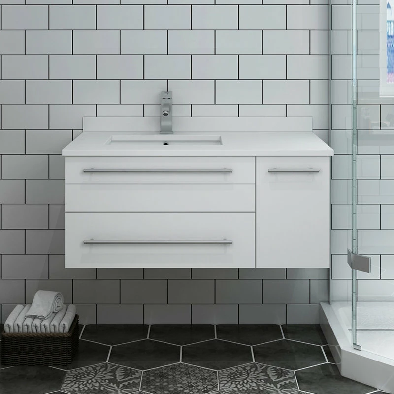 Classically simple with clean lines and a contoured undermount sink, this Fresca Lucera Wall Hung Modern Bathroom Cabinet will bring out the best in any bathroom. Measuring 36″ in width, this sophisticated cabinet has a well constructed solid wood frame with a roomy left-side compartment for holding bathroom essentials, and a spacious drawer with a decorative beveled drawer plate design. The door and drawer are soft-closing and feature slim brushed metal handles. This modern wall hung cabinet has a chic painted White finish. Gracing the top of the cabinet is a striking quartz stone countertop with backsplash and a white ceramic undermount sink which adds to its clean aesthetic. The sink is equipped with an integrated overflow and single hole faucet mount, ready for the faucet of your choice (sold separately).