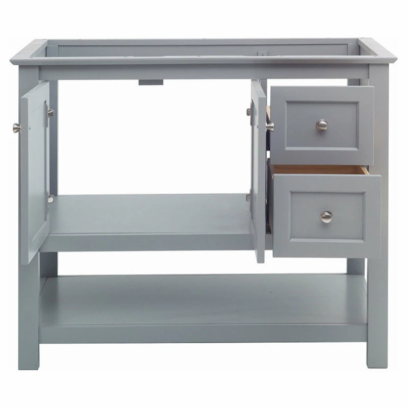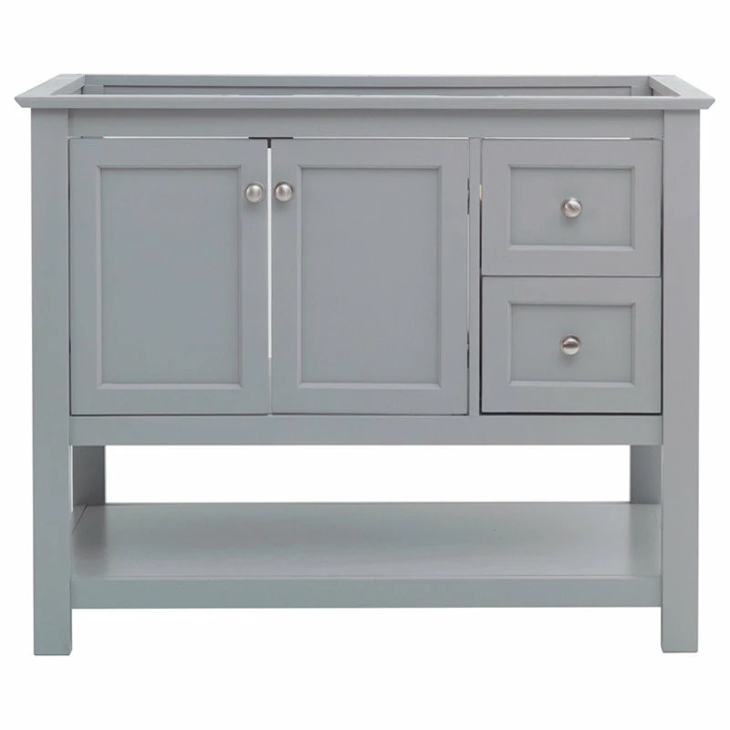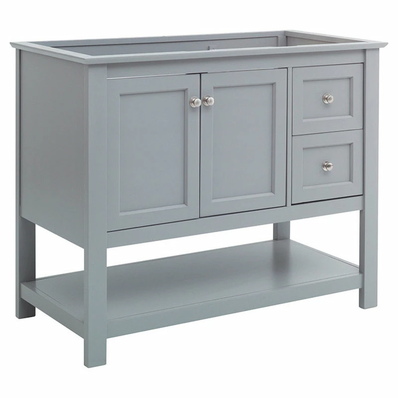 Add instant style and classic charm to your bathroom with the clean, timeless design of our Fresca Manchester 42๏ฟฝ Traditional Bathroom Cabinet. This beautifully constructed cabinet features panelled solid wood doors with soft close hinges to ensure they close silently and effortlessly every time. There are two soft closing drawers that offer ample space for your bathroom essentials and an open bottom shelf for storing towels and additional bath supplies. This traditional cabinet has an elegant, painted Gray finish and brushed nickel handles. It includes installation hardware and is available in several sizes and finishes to meet your decorating needs.