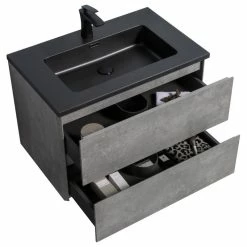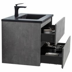 This black modern industrial styled cabinet made of MFC with deliberate designs of T shape hidden and 45″ invisible handle will become special and practical in your bathroom. The DTC soft-closing slide and the sound-deadening basin will help you create a silent using environment. Since the pieces are already assembled, after easy installation you will be able to enjoy your brand new vanity.Features:ENVIRONMENTALLY FRIENDLY HIGH-QUALITY MATERIAL- The bathroom vanity countertop integrated basin made by quartz sand which is one body Integrated molding, no water stain and easy to clean. Vanity material is MFC with a free painting plate E1 class which is good for health.MATTE BLACK QUARTZ SAND INTEGRATED SINK- Countertop basin surface covered by a nanometre black crystal particles which bring the sink a modern and crystal lustrous look. Its ultra-thin sink has a curved shape and efficiently prevents splashing. The well-functioning sink (WITHOUT FAUCET&POP UP & MIRROR) is easy to clean, scratch-resistant, and high-temperature resistant.LOW NOISE AND INVISIBLE HANDLE DRAWER- DTC soft-closing damping guide rail, noiseless while open or close. With 2 large drawers, both upper drawer lower drawer designed with 45″ beveled invisible handle which is more fit for fingers.U-SHAPED DRAINAGE PIPELINE ACCESS- George William Cabinetry’s Patented Design. ABS material ultra-thin u-shaped drainage pipeline access, offering more storage space while keeping a nice look.OVERSIZED STORAGE SPACE- Designed with 2-functioning drawers for you to put all the bath stuff. It will make your bathroom clean and tidy as well as save the space of your bathroom.Wall mounted vanity set with oversized storage cabinet and integrated basin.