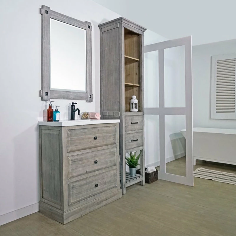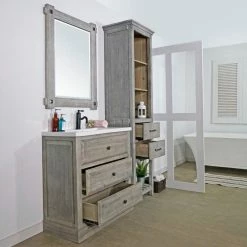 This rustic style bathroom vanity will be perfect for any small bathroom. The distressed driftwood finish gives the vanity a unique style. The ceramic sink top sits above two usable drawers to store your toiletries and other items.