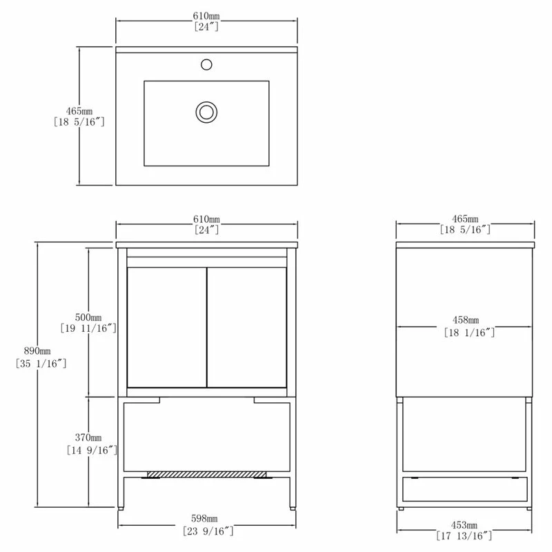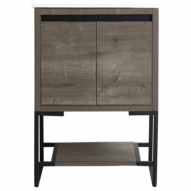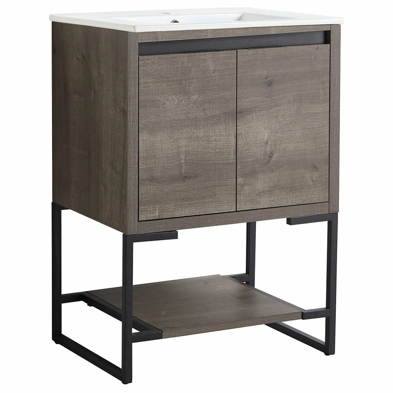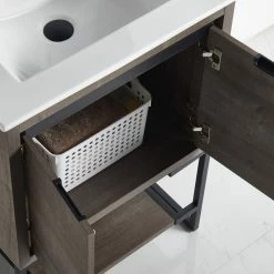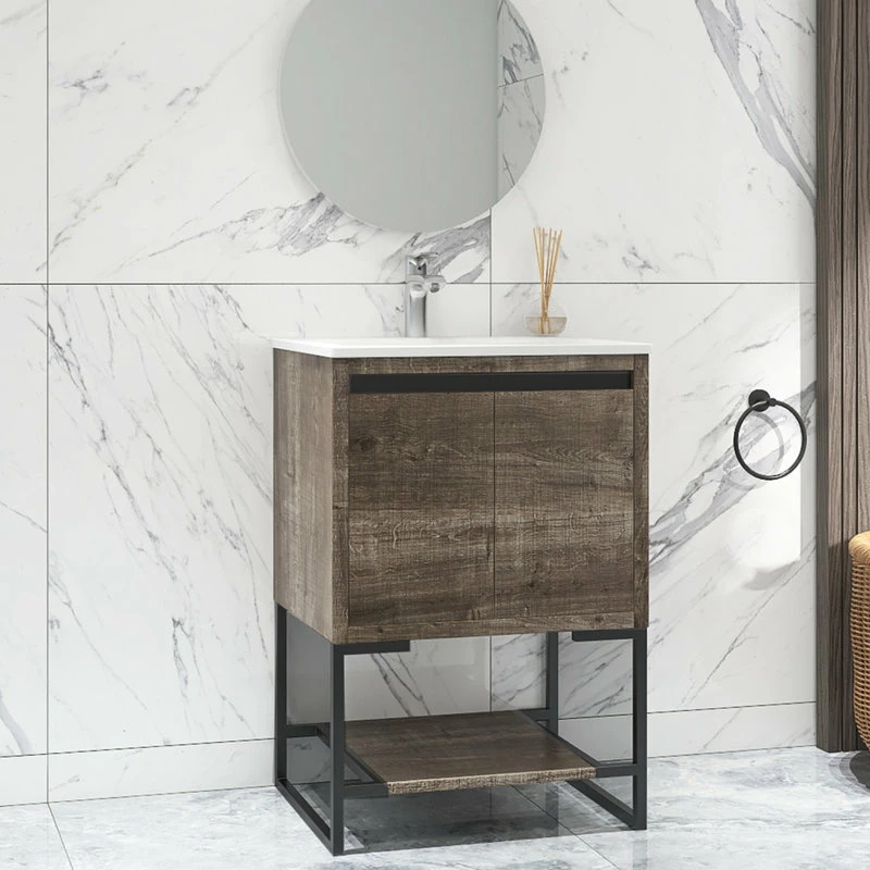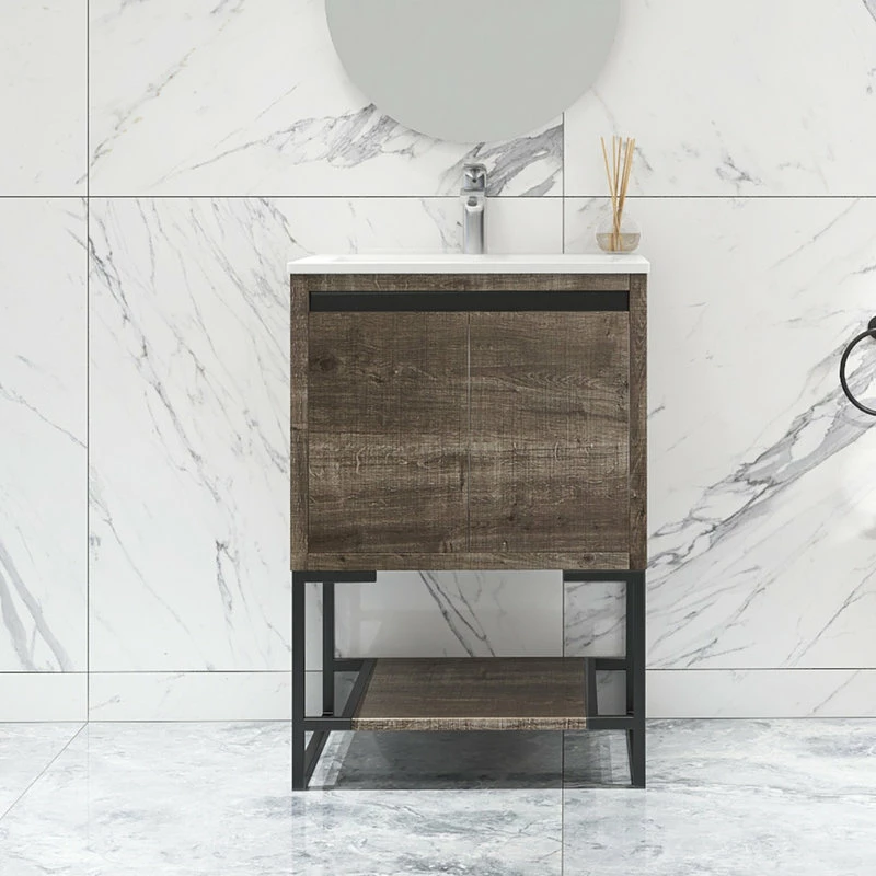 Brand New Design by making a gap with the door and top, combined with the different contrast colors to give you a brand new product. In the meantime, used concealed handle to make the woodgrain texture completely. We care not only useful but also joyful while using. Construct of high-quality wood. 1.8cm thickness of plywood makes the base more durable. SCRATCH&STAIN-RESISTANT melamine surface, which is easy to clean and easy to take care of it. With soft close doors and an open shelve. Make the storage more Flexible. You can store essential toiletries and bath items such as soaps, shampoos, shavers, mirrors in the cabinet, and you can put the towel on the open shelf that is easy to take. Easy clean and grand with the integrated sink made of premium ceramic, solid and durable. Features an overflow hole that prevents water leaks and spills. For your convenience, we have predrilled a single faucet hole- the faucet is not included. Assembled base. You can follow the step by step, only takes 10 min.[HIGHT QUALITY] Our bathroom vanities have constructed high-quality and eco-friendly plywood made of solid wood. 1.8cm thickness of plywood makes the bathroom furniture base more durable. This freestanding vanity with SCRATCH&STAIN-RESISTANT paint-free melamine surface is easy to clean and easy to take care of it.[NATURAL WOOD GRAIN] Realistic wood grains are not only natural-looking but also smooth surfaces. That fresh your day and night in your bathroom using this bathroom vanity. Scratch & Water-Resistant you do not concern with the bathroom’s wet environment because of the waterproof finish.[Ample Storage Space]With soft close doors and an open shelve. Make the storage more Flexible. You can store essential toiletries and bath items such as soaps, shampoos, shavers, mirrors in the cabinet, and you can put the towel on the open shelf that is easy to take.[Bathroom vanity with sink and basin] Easy clean and grand with the integrated sink made of premium ceramic, solid and durable. Features an overflow hole that prevents water leaks and spills. For your convenience, we have predrilled a single faucet hole. The faucet is not included.[ASSEMBLED ]The assembled vanity set shows when you open the box. You just only install the metal legs and the basin to the cabinet. Only two soft-close doors make the plumbing installation easier than the drawer. The hardware is made of high-quality metal which prevents corrosion and lasts longer.[SOFT CLOSE]Soft close hinges to avoid the noise. The hinges were tested more than 1000000 times to ensure daily use.[Open Shelf]Make the storage more Flexible. You can store essential toiletries and bath items such as soaps, shampoos, shavers, mirrors in the cabinet, and you can put the towel on the open shelf that is easy to take.[Metal Leg]WATERPROOF Legs constructed with Stain Steel and protected by paint.[Notice] Assembled Base(The base does not need assembly). The mirror and faucet are not included.