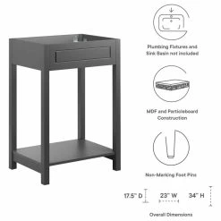 Refresh your bathroom space with the Altura 24″ Bathroom Vanity Cabinet. Boasting crisp, clean lines and a streamlined design, this modern vanity is durably crafted with painted MDF and particleboard and features inset detailing for subtle added interest. This vanity features a spacious open storage shelf to accommodate decor or bathroom essentials. Altura includes non-marking foot caps to protect flooring. Sink basin and fixtures not included. Assembly required.