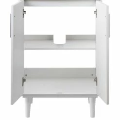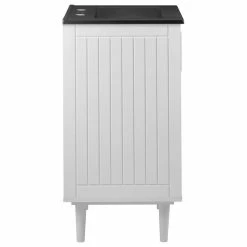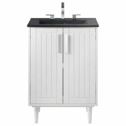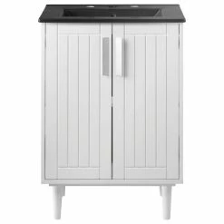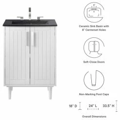 Embrace the subtle sleekness of the Augusta 24″ Bathroom Vanity. Augusta features crisp lines and a stately design that seamlessly updates your bathroom decor. Solidly constructed from wood and MDF particleboard, the Augusta Vanity sits on four tapered legs and provides hidden storage shelves behind soft-close doors. Complete with a ceramic sink basin with 8-inch centerset holes and an integrated countertop, the Augusta Bathroom Vanity aligns style with function for a modern bathroom. Augusta comes with non-marking foot caps to protect flooring. Assembly required. Fixtures not included.