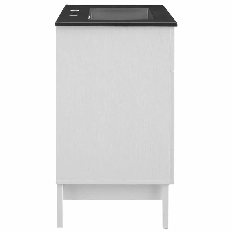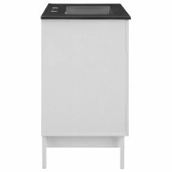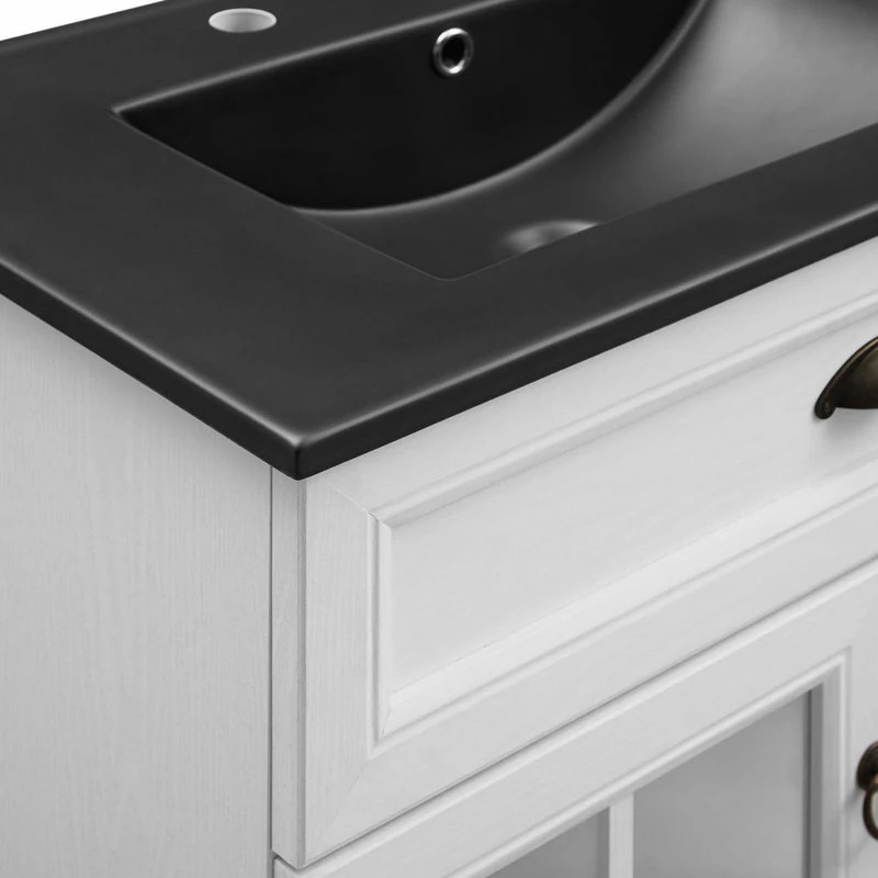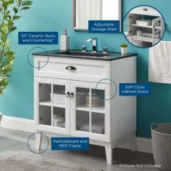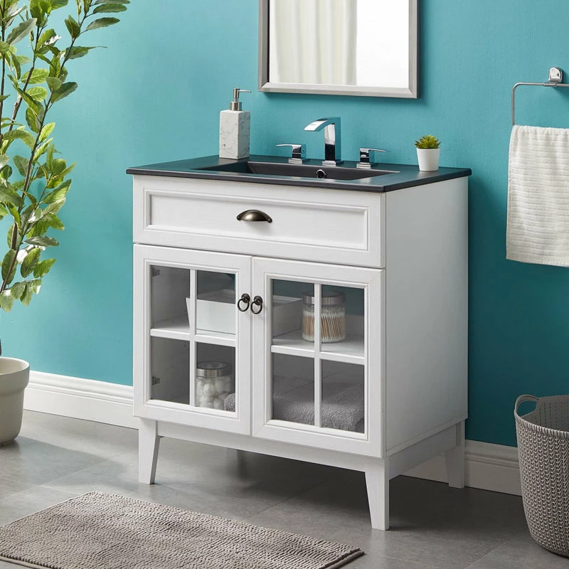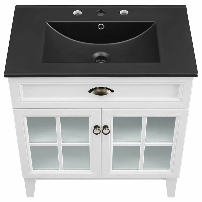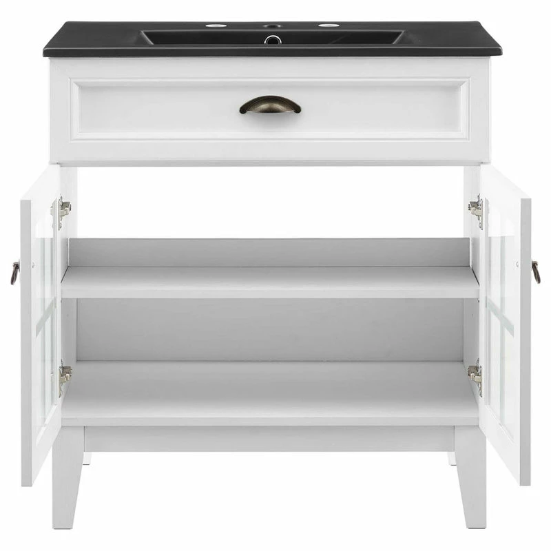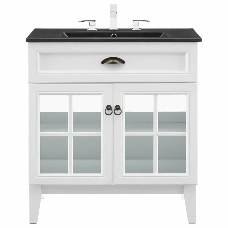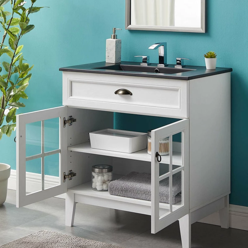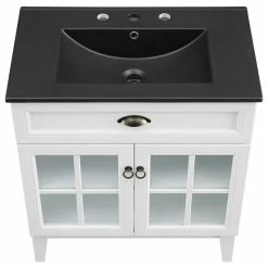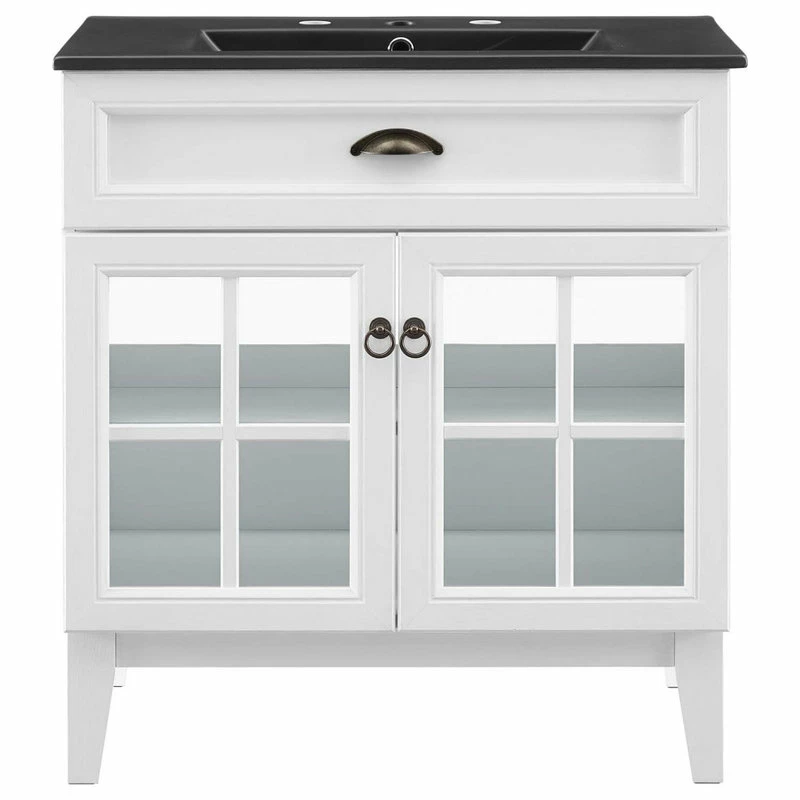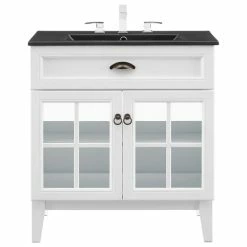 Invite the provincial charm of the Isle 30″ Bathroom Vanity Cabinet to transform your bathroom space. Made of sturdy particleboard and MDF, Isle’s coastal contemporary design features a fixed drawer and an adjustable shelf for under-sink storage behind two glass windowpane doors. A curved ceramic sink basin with an integrated countertop and 8″ centerset faucet holes brings stylish functionality to this bathroom vanity. With a solid construction, this bathroom vanity cabinet brings contemporary design and coastal style to your bathroom space. Assembly required and fixtures not included.