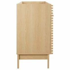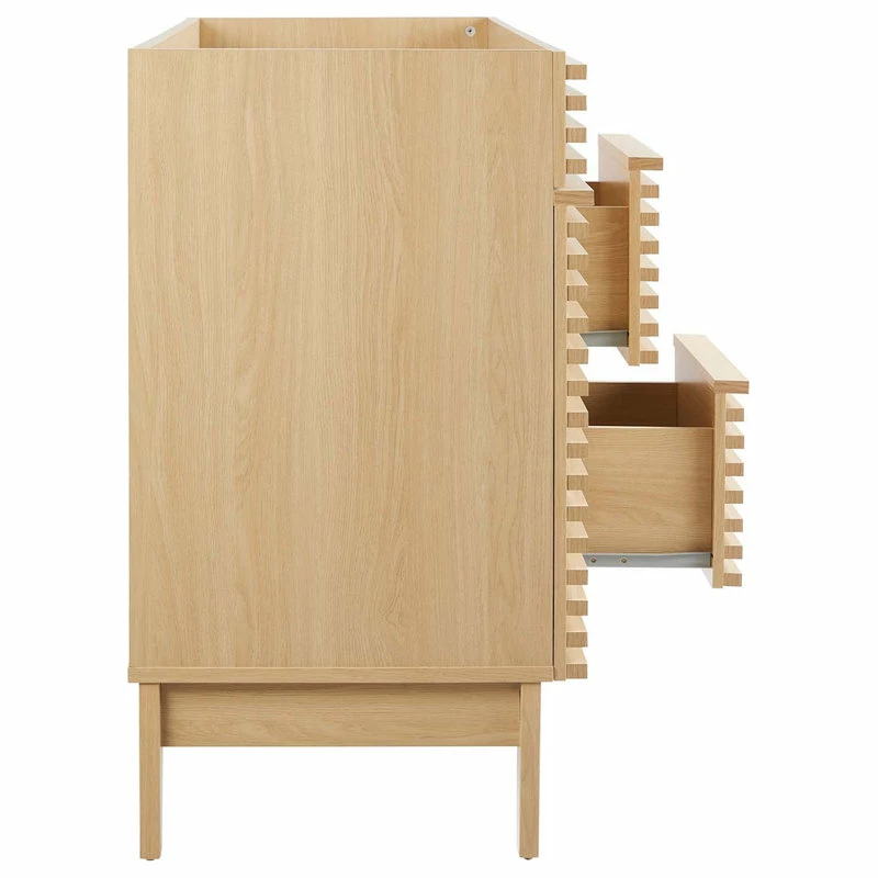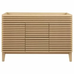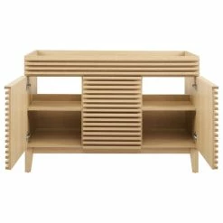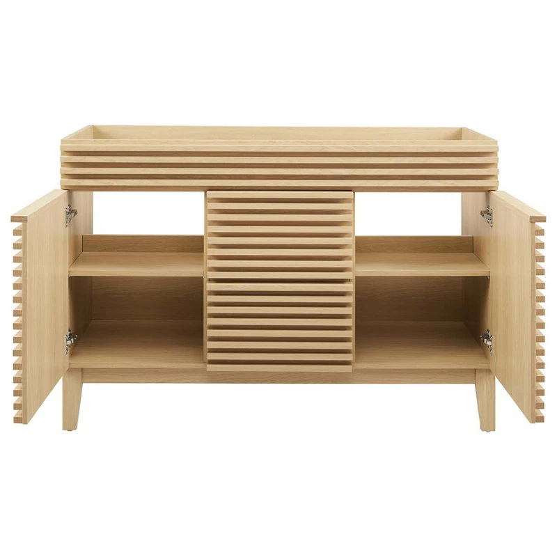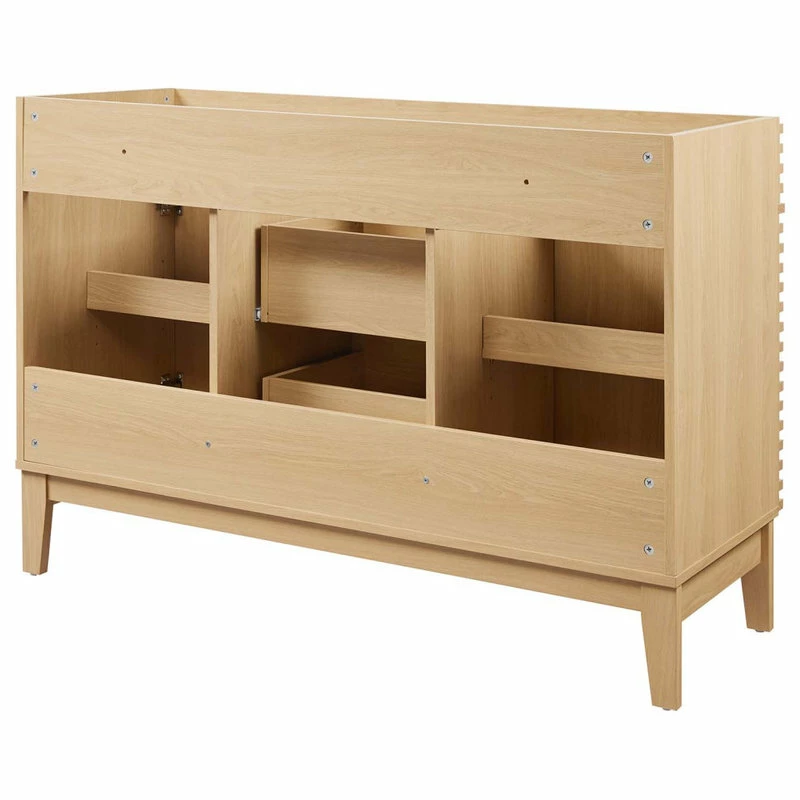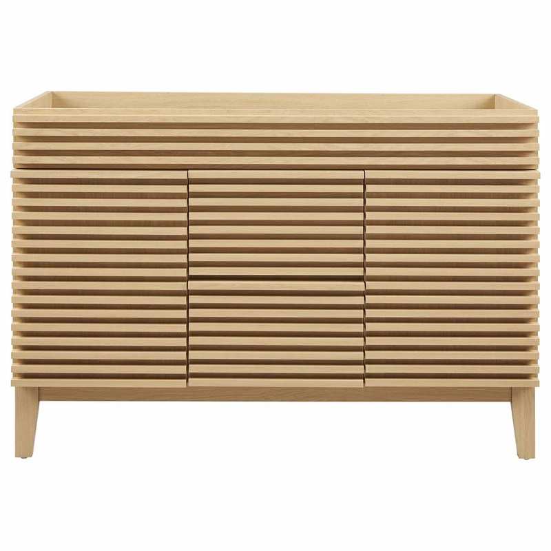 Tap into mid-century aesthetics with the Render 48″ Vanity Cabinet. The Render Bathroom Vanity features a durable particleboard frame with a smooth laminate, four tapered wood legs, full extension drawers, and adjustable storage shelves behind soft-close hinged doors. Sleek lines and crisp design align for an edgy style designed to meet your needs. Boasting a mid-century modern style, this vanity features a solid construction with a pleasing look and practical functionality. Assembly required. Sink basin and fixtures not included.
