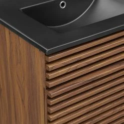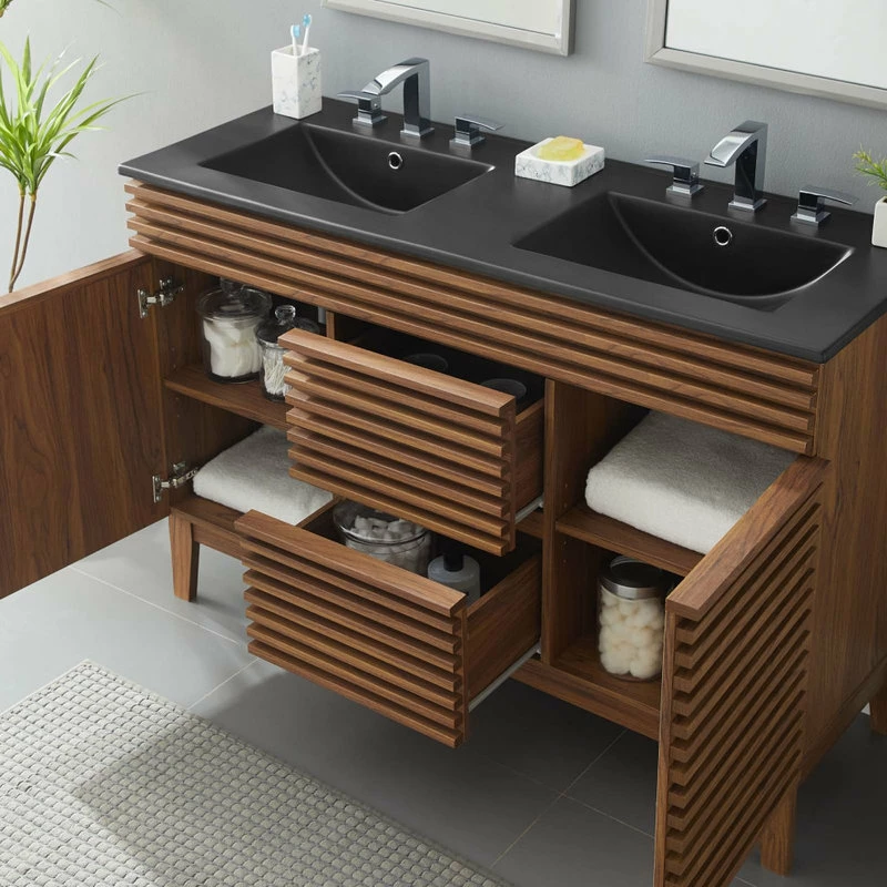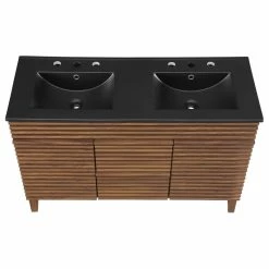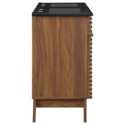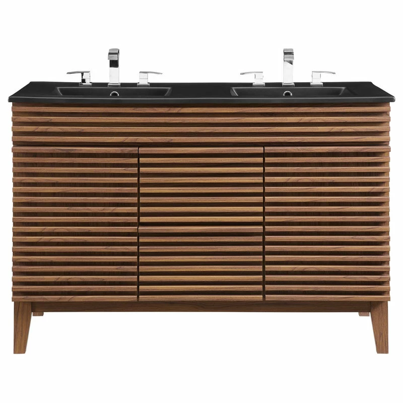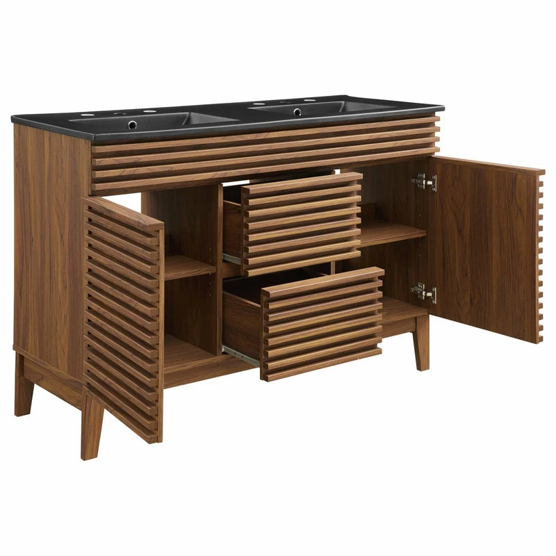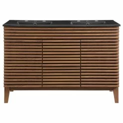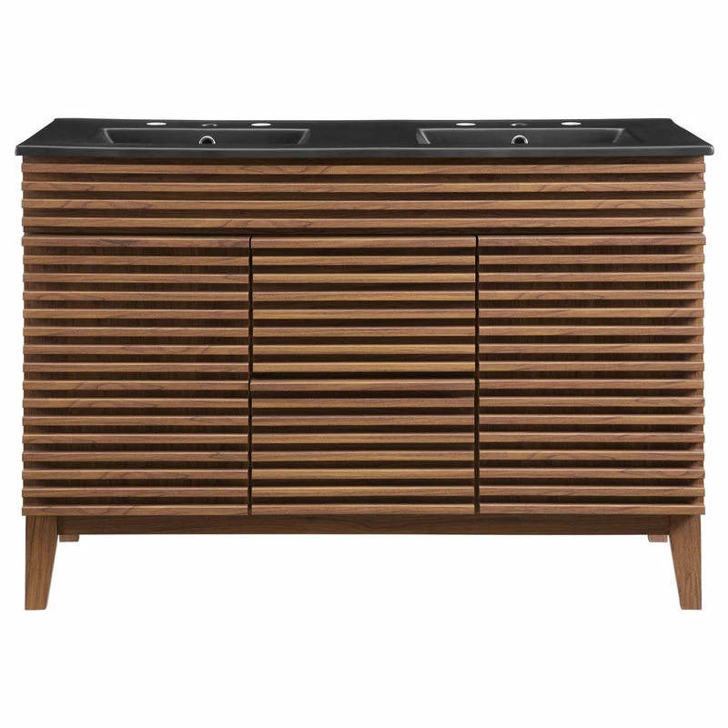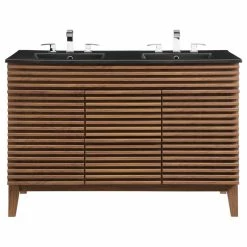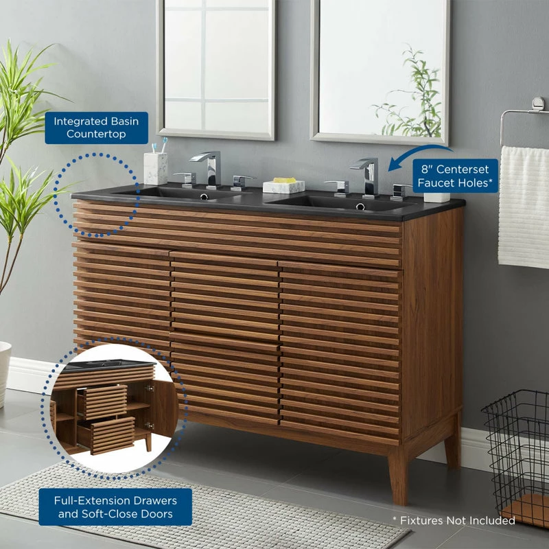 Tap into mid-century aesthetics with the Render Vanity. The Render 48″ Bathroom Vanity features a durable MDF and particleboard frame with smooth walnut grain laminate, four tapered wood legs, and ample under sink storage space in full-extension drawers and behind soft-close hinged doors. Crafted with ceramic, a double sink with an integrated countertop, 8″ centerset faucet holes, and rectangular sink basins continues the sleek look of this retro modern vanity. Clean lines and crisp design align for an edgy style designed to meet your needs. Boasting a mid-century modern style this vanity features a solid construction with a pleasing look and practical functionality. Assembly required and fixtures not included.