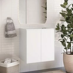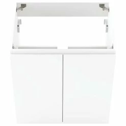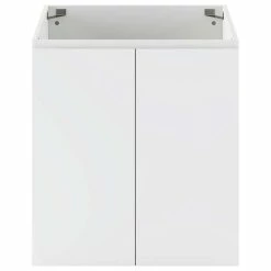 The sleek look and clean-lined silhouette of the Vitality 24″ Wall-Mount Bathroom Vanilty add modern style to your bathroom space. Durably crafted with particleboard and melamine, this vanity mounts directly to the wall and features ample storage space under the sink behind two soft-close doors. Assembly required. Sink basin and fixtures not included.