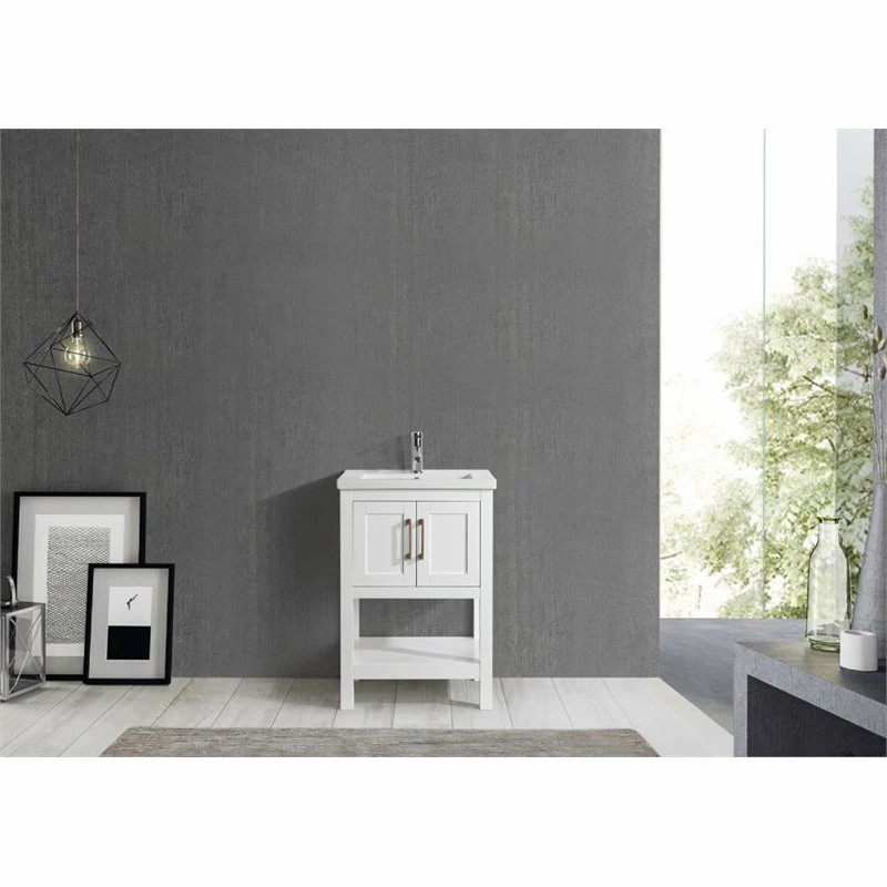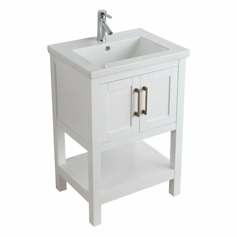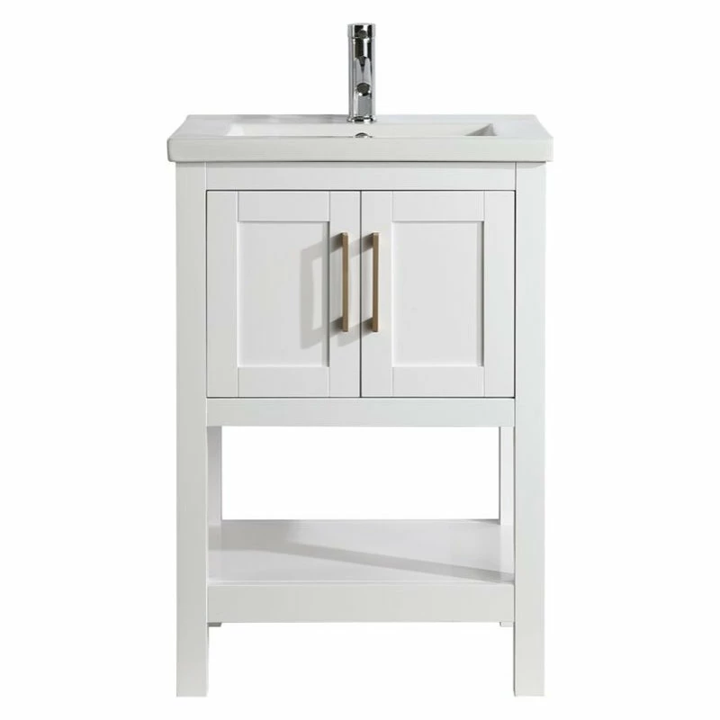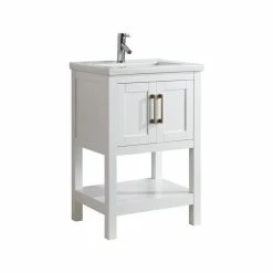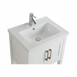 The Maklaine 24 inch single sink vanity by Design Element provides the perfect finishing touch to your bathroom remodel project. Constructed of durable PVC material, this vanity will maintain its beauty and functionality year after year. The porcelain countertop and integrated sink with overflow perfectly matches the styling of the cabinet, and is extremely simple to maintain. The 2 fully functional doors are soft closing, and the included brushed brass hardware perfectly complements the white cabinet. Faucet and drain are not included.