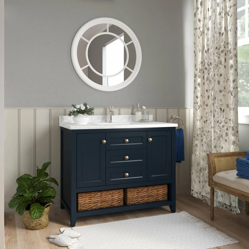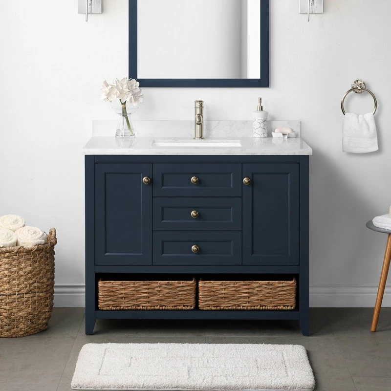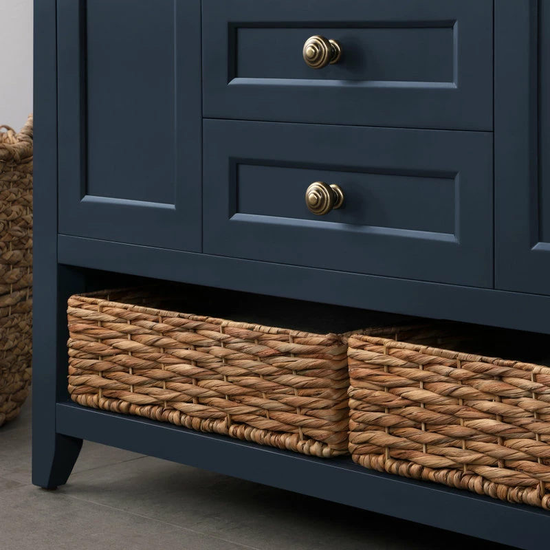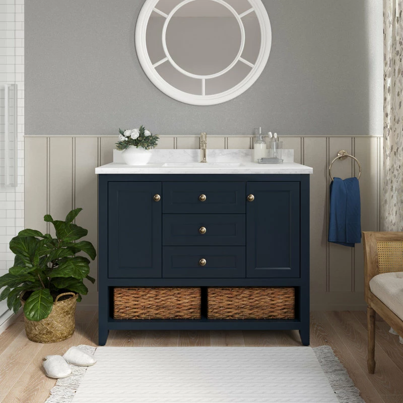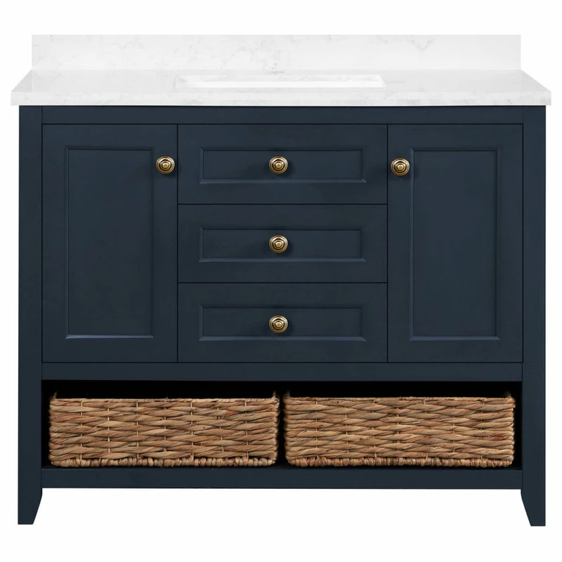 A refreshing Midnight Blue lacquer finish draws all eyes to the jaunty Granary 42-inch vanity by Martha Stewart. This transitional stunner features a gorgeous White cultured marble countertop fashioned from a double thick slab with straight edge, matching 3-inch high backsplash, and an undermount rectangular sink. Two spacious single door panelled cabinets plus a tilt-down and two regular drawers with brass hardware and soft-close hinges and glides offer ample storage. A decorative open bottom shelf with two handsome woven baskets included is perfect for stashing away all your bathroom tools and toiletries.