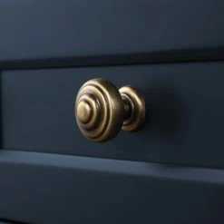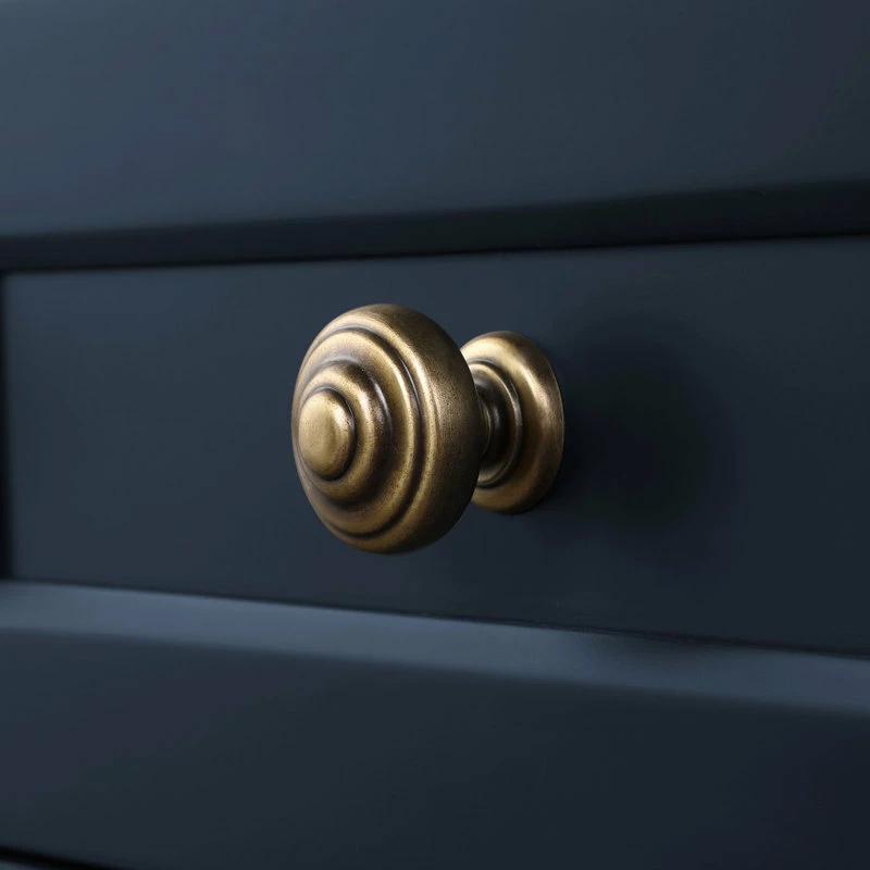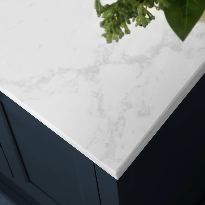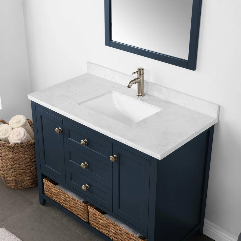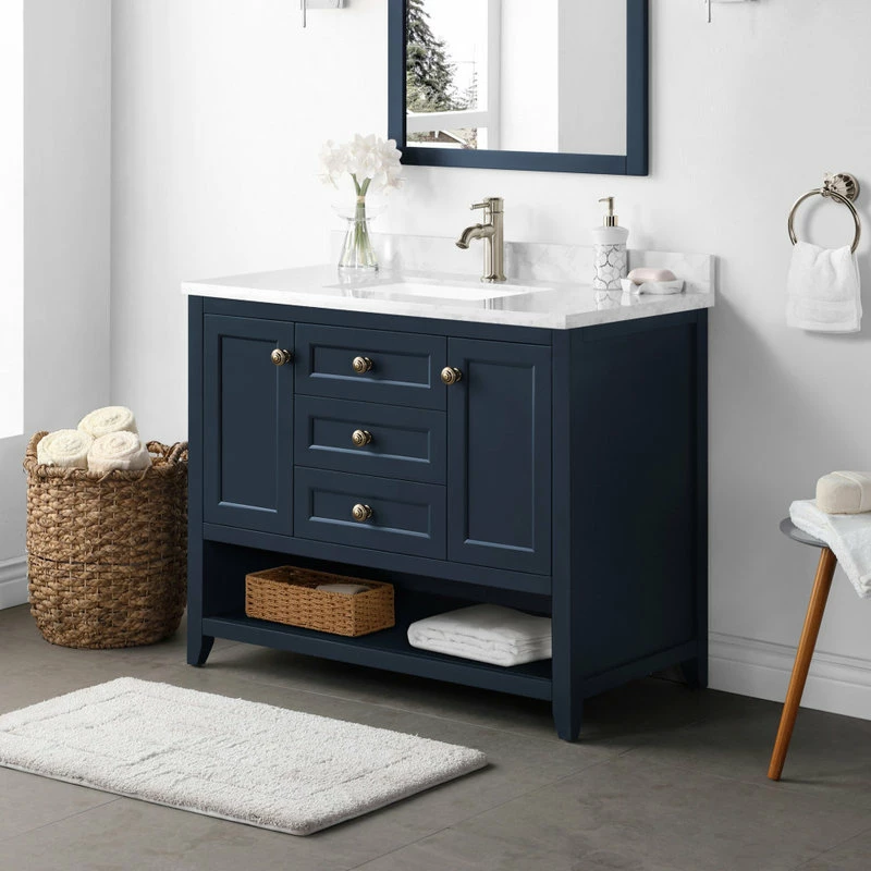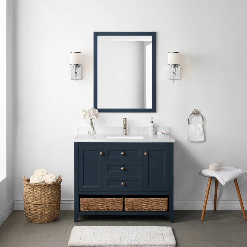 A refreshing Midnight Blue lacquer finish draws all eyes to the jaunty Granary 42-inch vanity by Martha Stewart. This transitional stunner features a gorgeous White cultured marble countertop fashioned from a double thick slab with straight edge, matching 3-inch high backsplash, and an undermount rectangular sink. Two spacious single door panelled cabinets plus a tilt-down and two regular drawers with brass hardware and soft-close hinges and glides offer ample storage. A decorative open bottom shelf with two handsome woven baskets included is perfect for stashing away all your bathroom tools and toiletries.