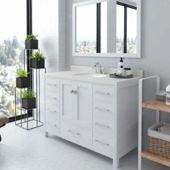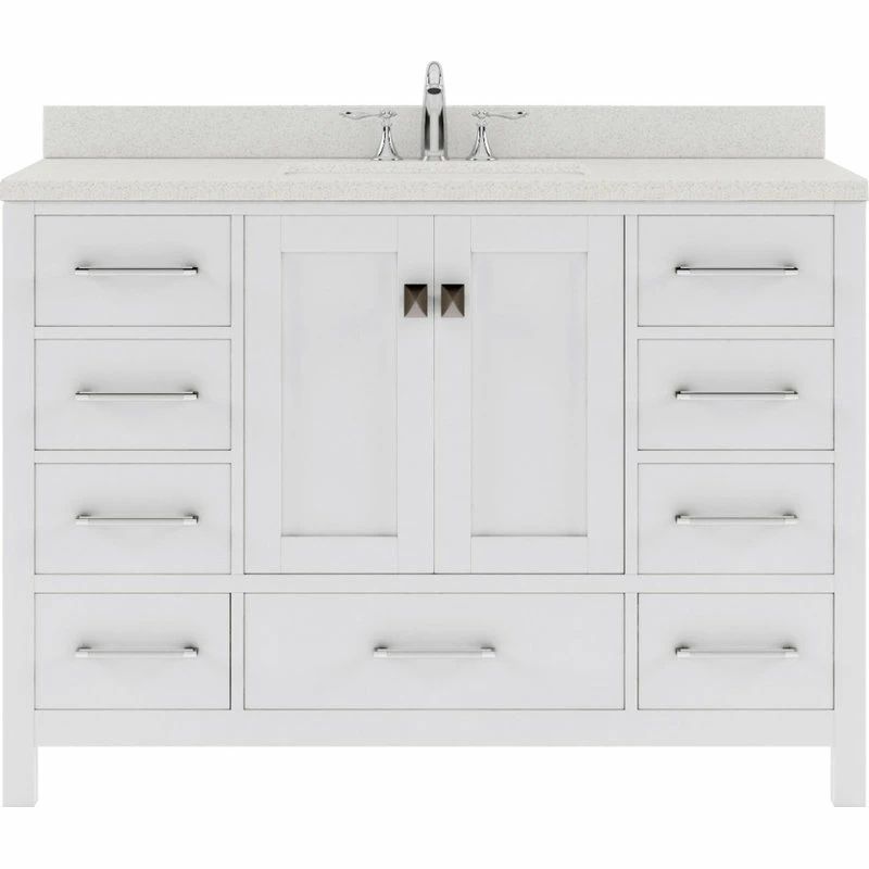- Includes: 48″ White Cabinet, Dazzle White Quartz Countertop, 1 Round Undermount Sink