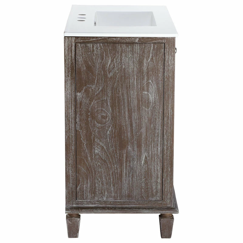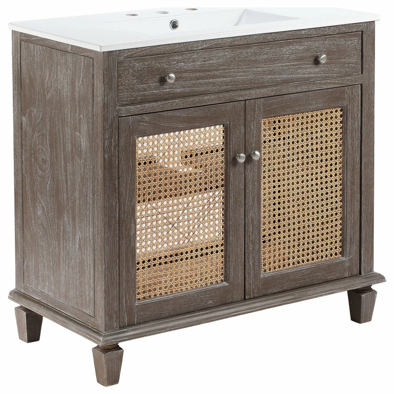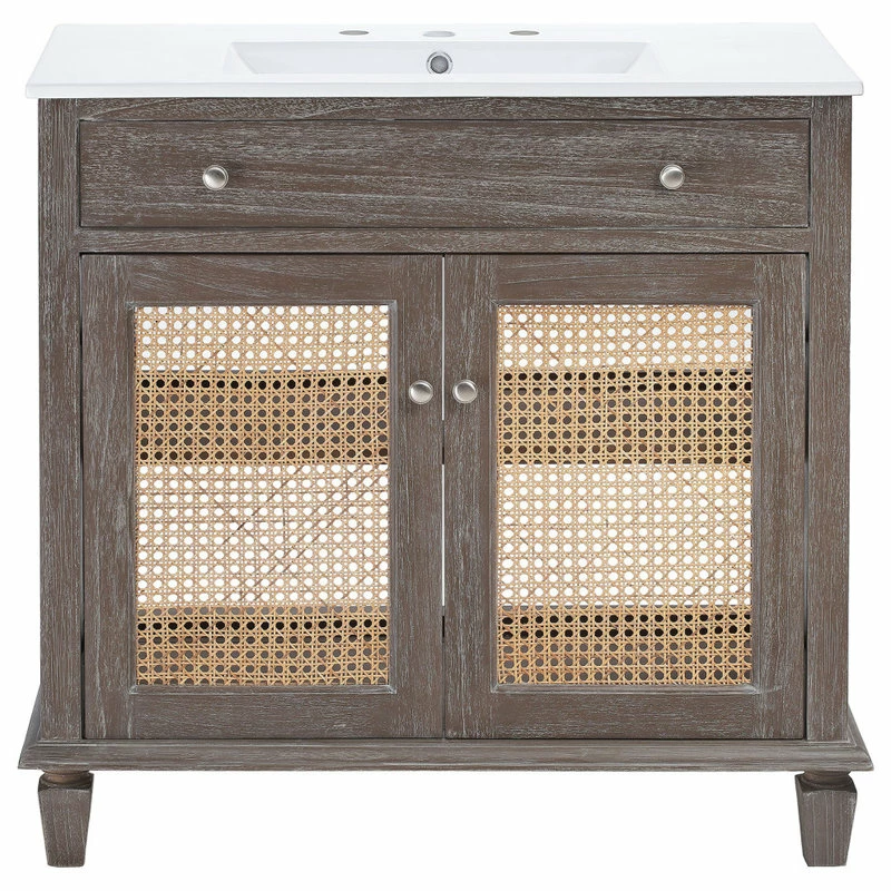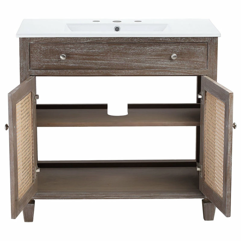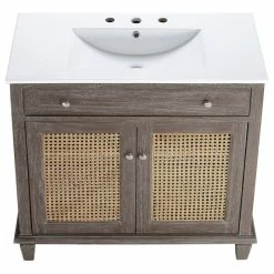 Encompassing the coastal aesthetics of tropical design, the Lilo 36″ Bathroom Vanity effortlessly updates a bathroom space. Durably constructed with solid mindi wood, this vanity features a faux top drawer and two soft-close hinged doors adorned with natural rattan cane detail. Behind the two closed doors is an adjustable shelf and ample storage space to keep visual space clean and your bathroom essentials organized. This wood vanity features a ceramic sink basin with 8-inch centerset holes and an integrated countertop aligning style and function. Includes non-marking foot caps. Assembly required. Fixtures not included. Set Includes: One – 36″ vanity cabinet, One – Cayman 36″ Bathroom Sink