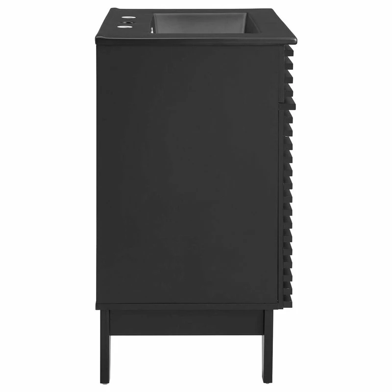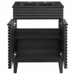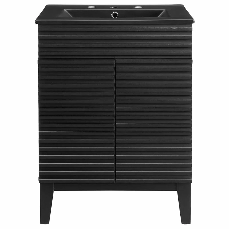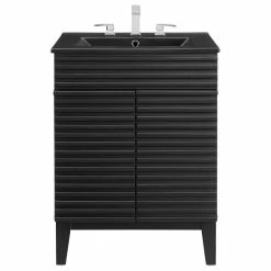 Tap into mid-century aesthetics with the Render Vanity. Render Bathroom Vanity features a durable particleboard frame with smooth laminate, four tapered wood legs, and adjustable storage shelf behind two soft-close hinged doors. A curved ceramic basin and integrated countertop with three faucet holes create sleek lines and crisp design for an edgy style designed to meet your needs. Boasting a mid-century modern style this vanity features a solid construction with a pleasing look and practical functionality. 8″ centerset faucet holes. Assembly required and fixtures not included. Set Includes: One – 24″ Ceramic basin top, One – Render Bathroom Vanity