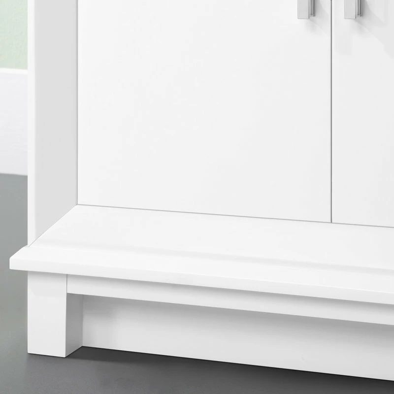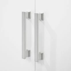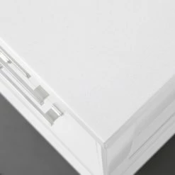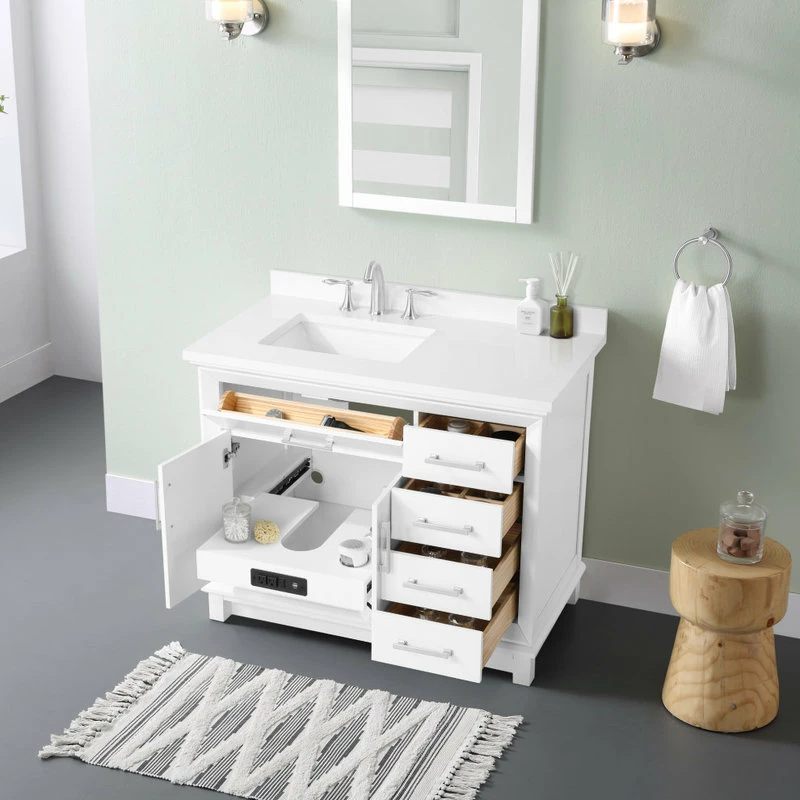 - Two soft-closing doors with a fully extendable sliding shelf with power bar to organize toiletries and charge devices, one tilt-down top drawer to store small items and four functional drawers.