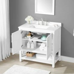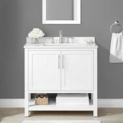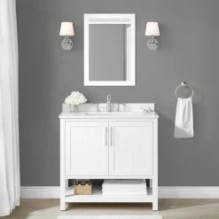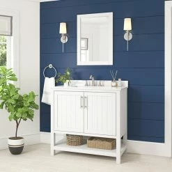 The Concord vanity cabinet takes a nostalgic beach-house-inspired silhouette and updates it to accommodate any contemporary bathroom considerations. It combines a rustic white beadboard finish with a premium engineered stone countertop and integrated sink for easy use and maintenance. Its 2-door cabinet with adjustable interior shelf, along with bottom open shelf, means that your bathroom will be clutter-free.