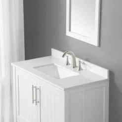 - Sleek white engineered stone countertop houses integrated sink basin with predrilled 8 faucet hole