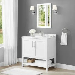 - Freestanding rustic-style vanity cabinet with age resistant white finish