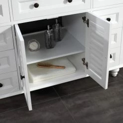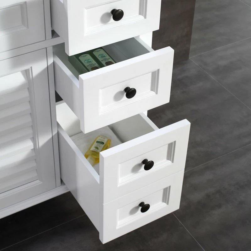 Give your bathroom a stylish update with the Heather Vanity. This sophisticated vanity is made from white wood with a speckled beige countertop and backsplash. Its soft-close drawers and cabinet provide ample storage space for your toiletries and bathroom essentials.
