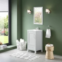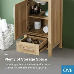Whether itโs for a small powder room or your family bathroom, the Kansas bathroom vanity from OVE Decors brings that beach cottage feel to your home. Available in several colors and sizes, the Kansas is both stylish with its beadboard detailing and functional, making it a piece of furniture you will enjoy for years to come. Its one-piece ceramic countertop with integrated basin makes the most of the compact surface space. This freestanding piece includes a single-door cabinet with adjustable interior shelf and a bottom drawer, all with soft-closing mechanisms. The vanity comes with premium quality hardware in a brushed nickel finish. Pre-assembled for easy installation, the Kansas is available in widths of 18-in, 24-in, 30-in and 36-in and in a variety of finishes including White, Dove Grey, Midnight Blue and White Oak.