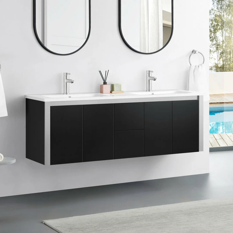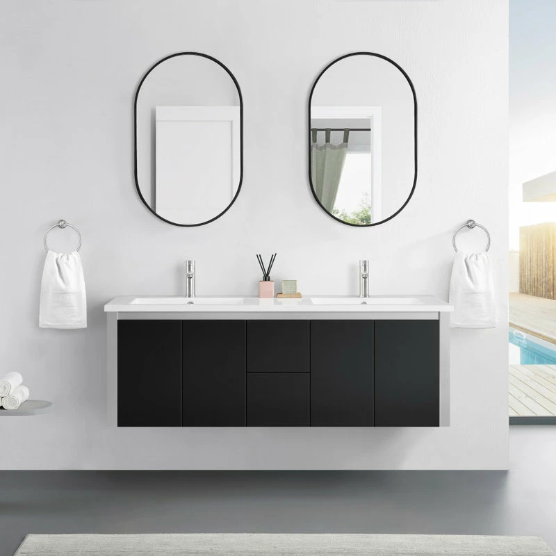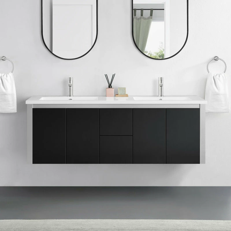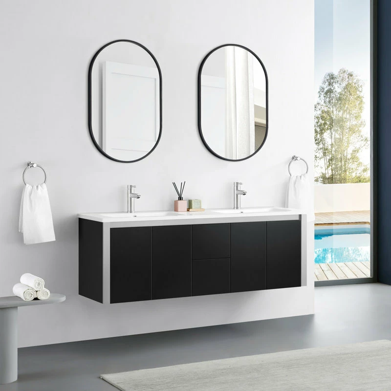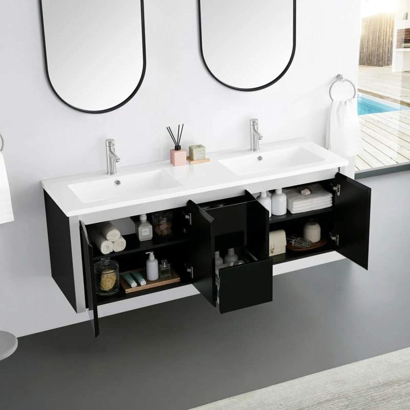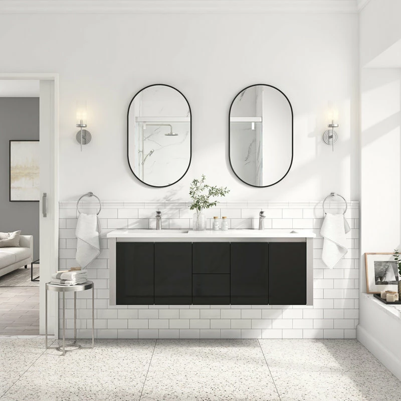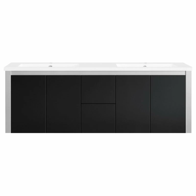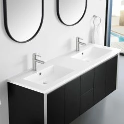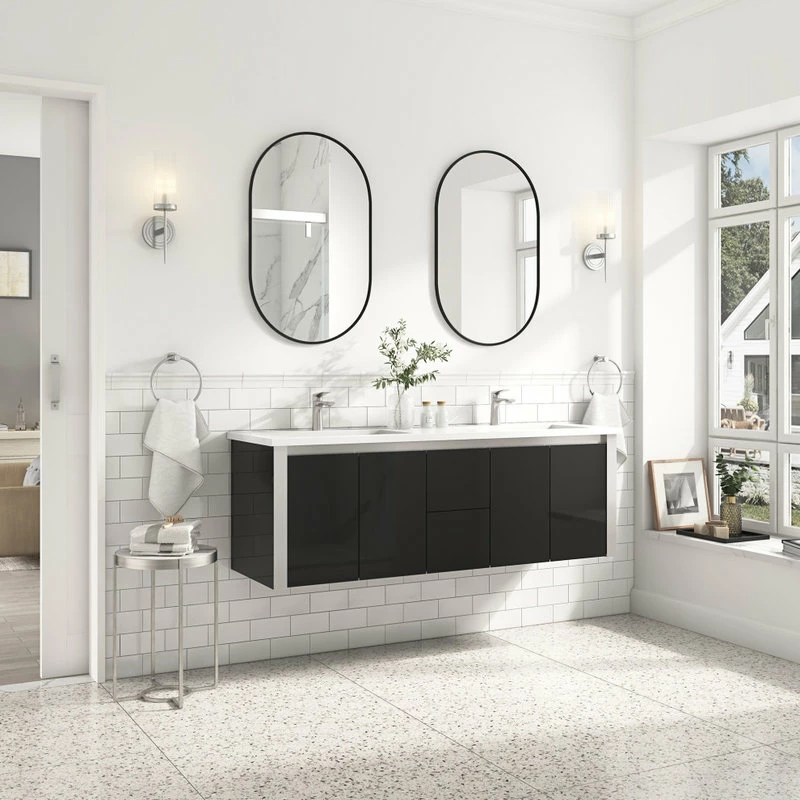 Clean lines and sleek countertops are what make up this modern double sink vanity, the Lelio III, from Ove Decors. This wall-mounted vanity comes in American Grey, Matte Black and Glossy White – modern tones that match any bathroom reno or update – and offers more than enough storage with 2 deep, soft-close drawers and adjustable shelves. Brushed nickel accents and concealed hinges on the doors add to the flawless look this vanity will bring to any master or shared bathroom.