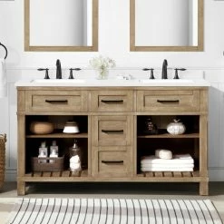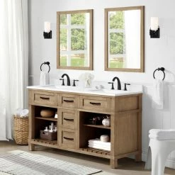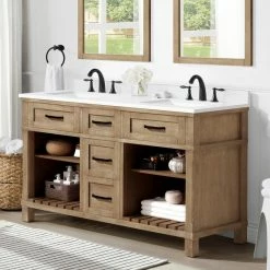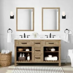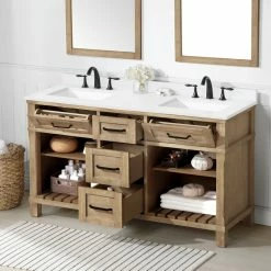 - Martha Stewart Ridgefield 60-in Antique Oak Undermount Double Sink Bathroom Vanity with Snow White Engineered Quartz Countertop by OVE Decors, versatile enough for any transitional bathroom design