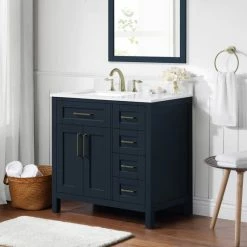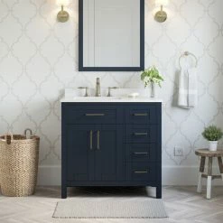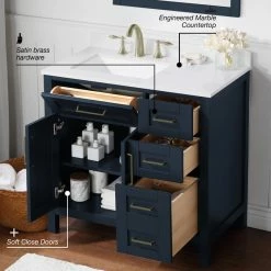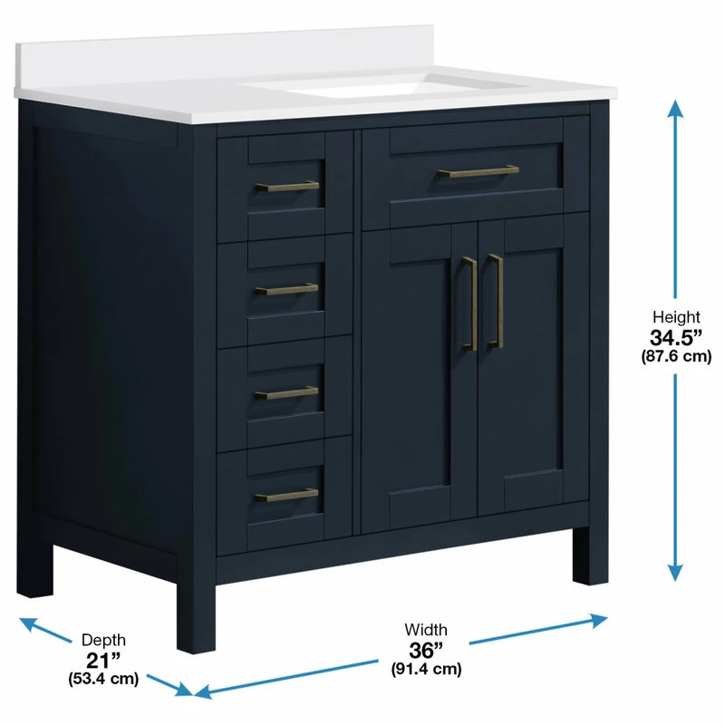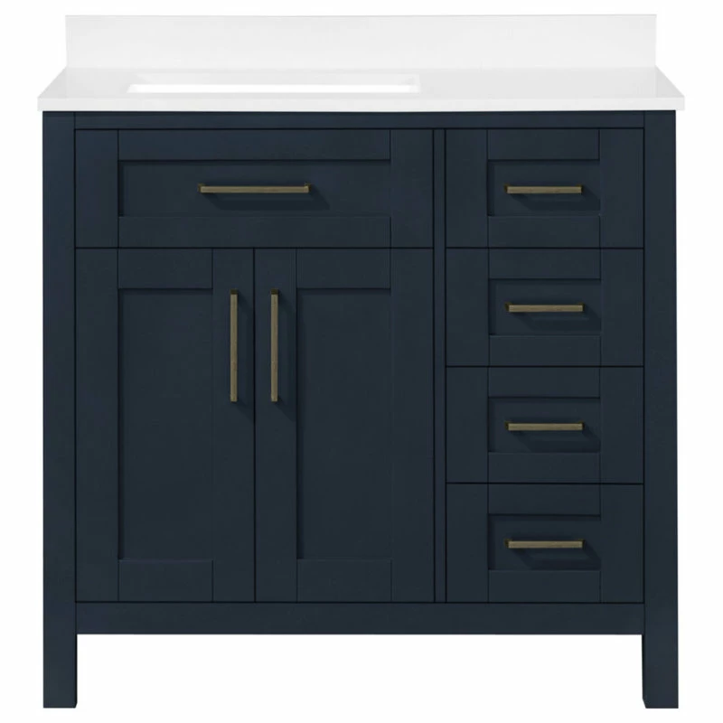 The Tahoe 36 in. vanity is the perfect solution big storage in a smaller space. Attention to detail and functionality are what really make this piece special. From drawers with built-in organizers to a flip-down front drawer, we made sure to utilize every inch of storage space. The Tahoe is appropriately complimented by modern brass pulls and soft-close hinges and drawer glides. In addition, a large 20 in. under mount ceramic sink topped with lavish engineered stone top for a truly astonishing overall effect.