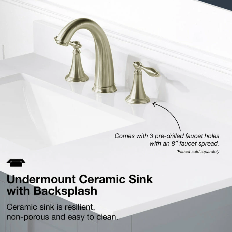 - Engineered Stone countertop with double thickness and bullnose edge. Pre-drilled for 2 x 8-in. faucet spread. Countertop and cabinet comes pre-assembled to simplify installation.