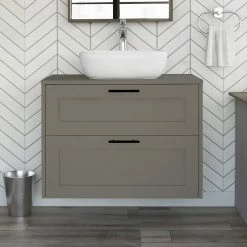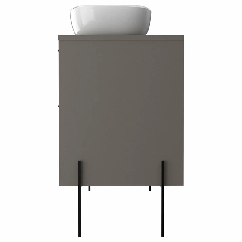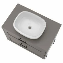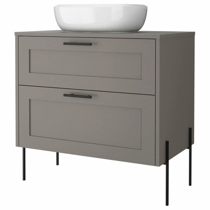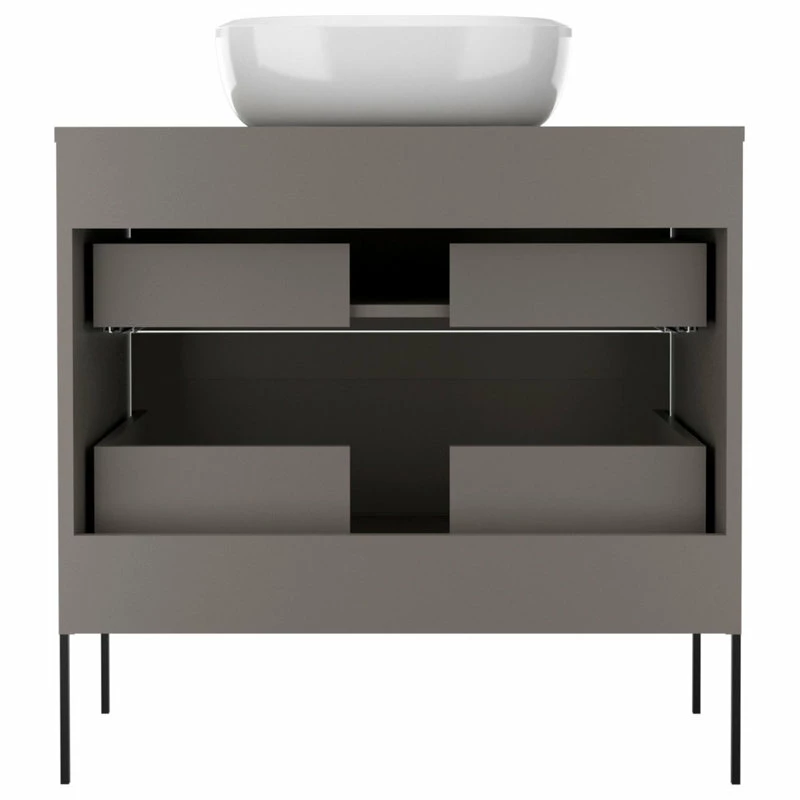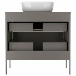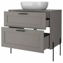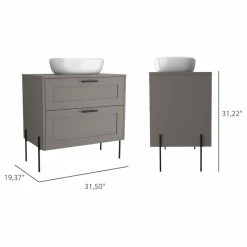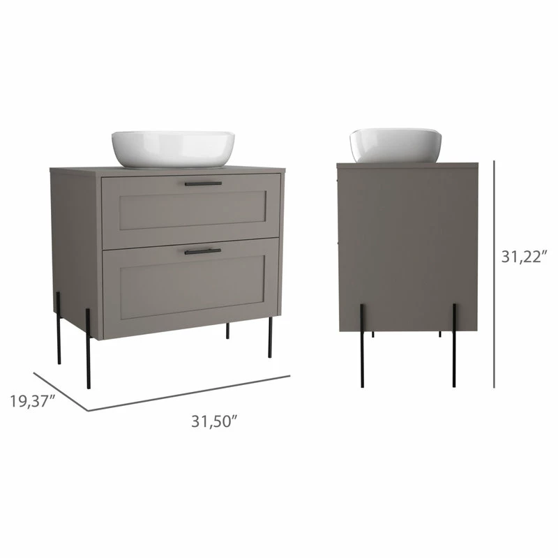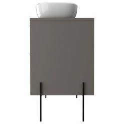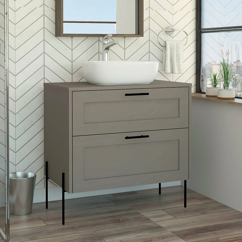 Center your bathroom oasis with a European style vanity on freestanding legs. This versatile piece is ready to work in a variety of bathroom floor plans and unique remodels. It has two contemporary, soft-close drawers that are perfect for toiletry storage and the top is crowned with a porcelain vessel sink. Faucet and p-trap not included.