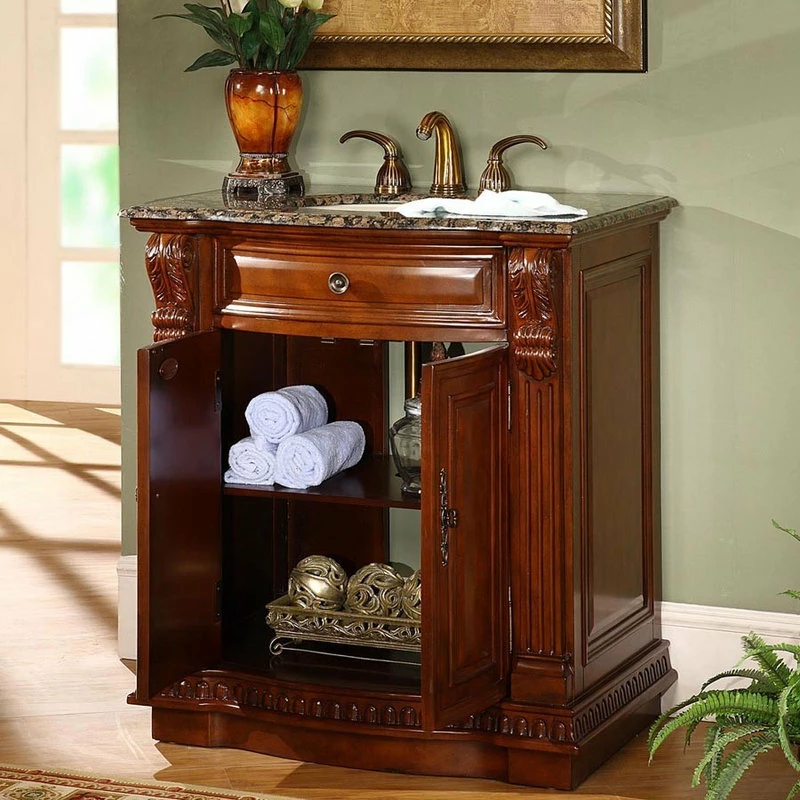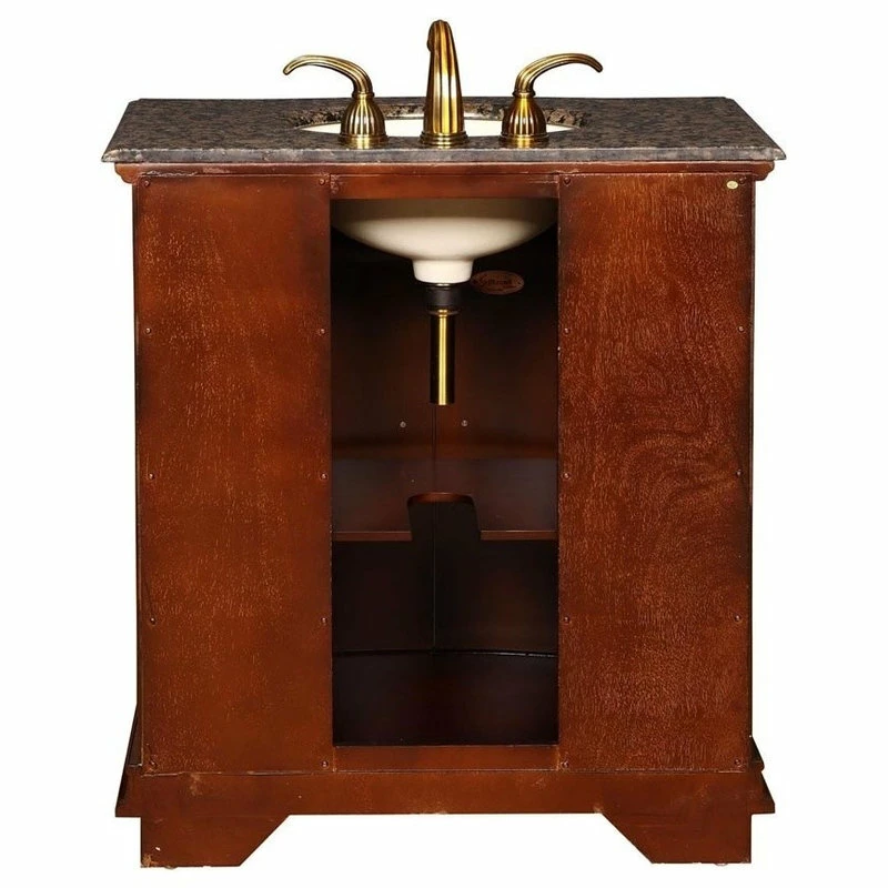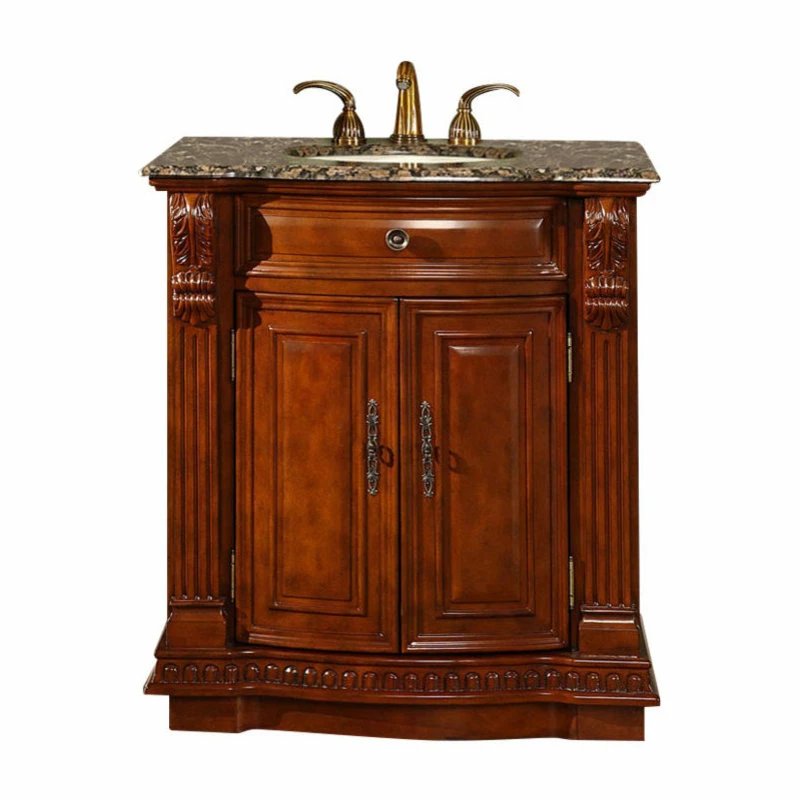 This classic design bathroom vanity has beautiful hand carved moldings. This antique brown finished piece features two doors with picture frame moldings, and a solid Baltic Brown Granite top that is pre-drilled for a three hole faucet.