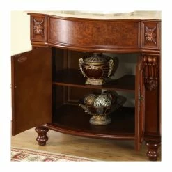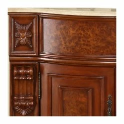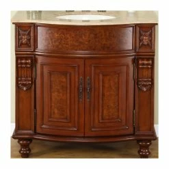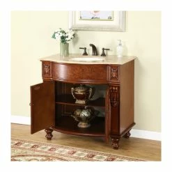 Hand crafted two doors single sink vanity cabinet with antiqued brown finish. Travertine top with antiqued brass hardware.