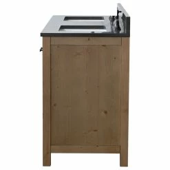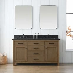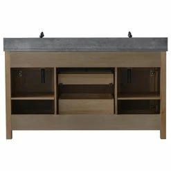Maximize your bathroom space with this 60″ vanity. Featuring beautiful textured wood grain veneer paired with a natural blue limestone top. Available in textured gray or weathered natural with matte black hardware