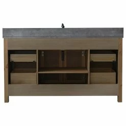 Maximize your bathroom space with this 60″ vanity. Featuring beautiful textured wood grain veneer paired with a natural blue limestone top. Available in textured gray or weathered natural with matte black hardware