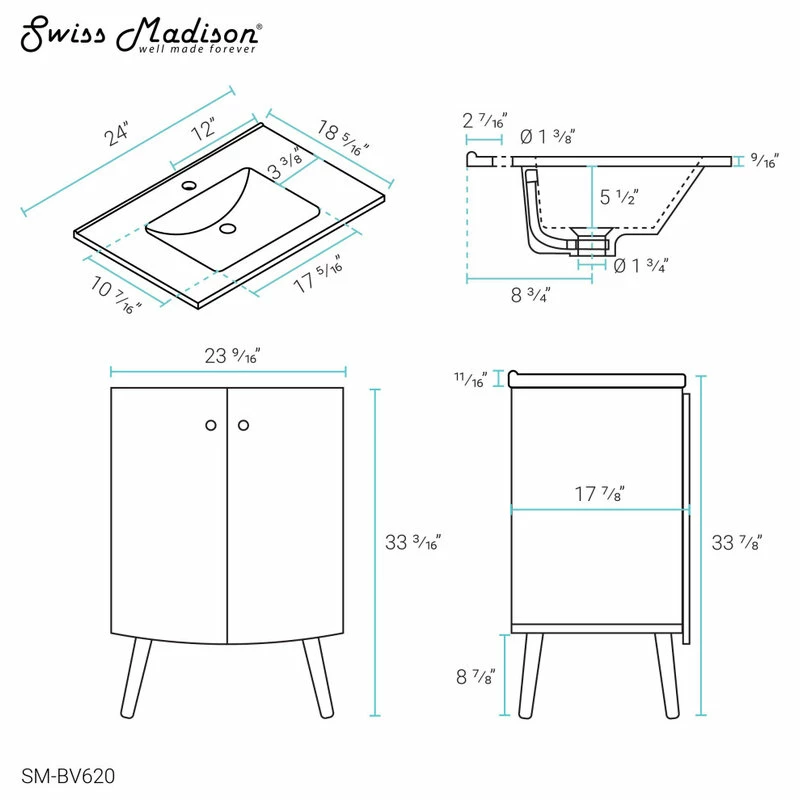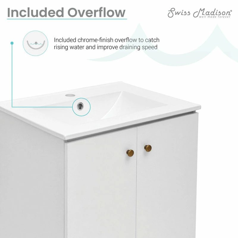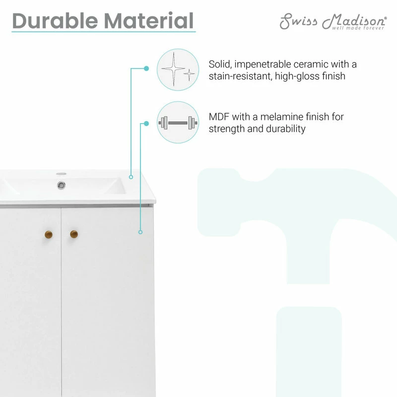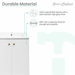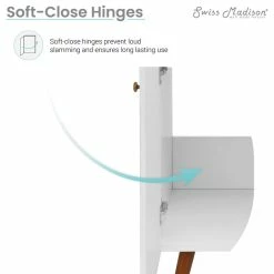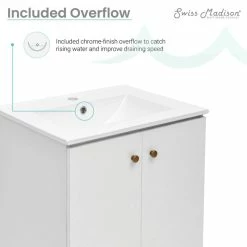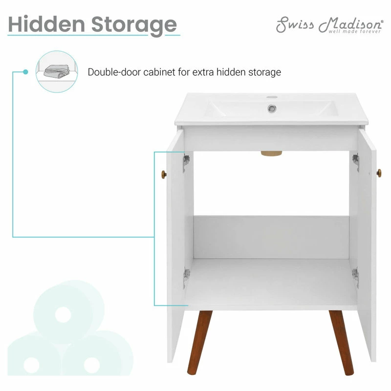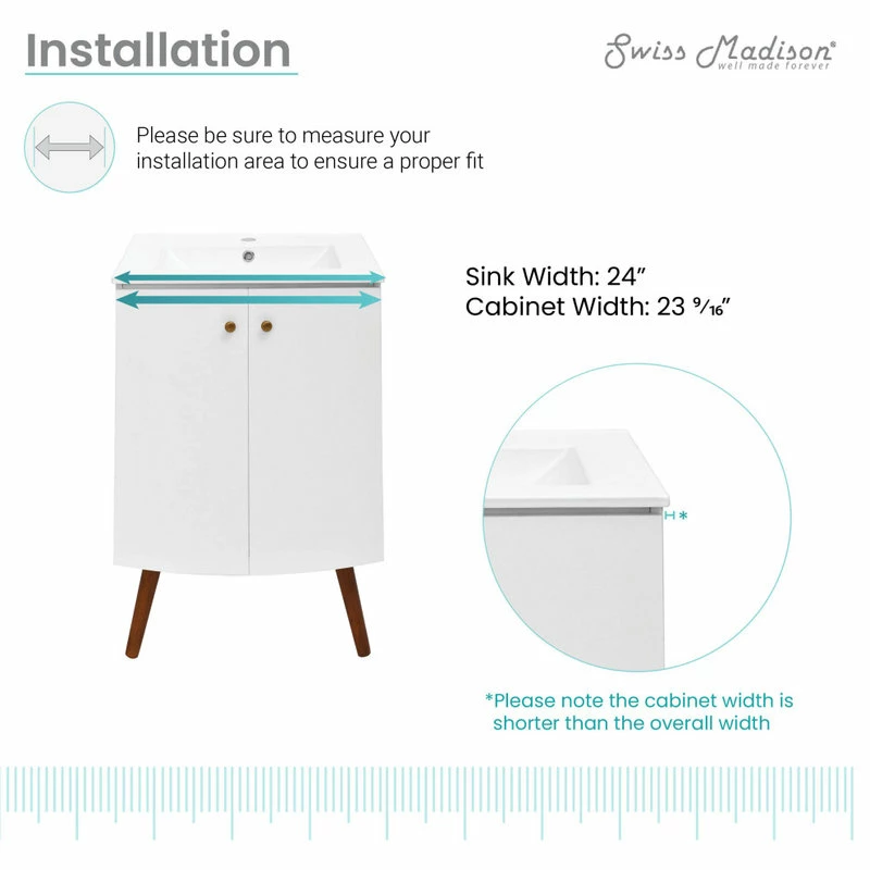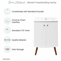 The Manoir Bathroom Vanity has a sleek, mid century look designed to elevate any bathroom setting. This vanity’s compact design features one soft, slow closing door for ease-of-use and to help maximize storage space. This sturdy and easy-to-install design complements a multitude of bathrooms and can be paired with any Swiss Madison Faucet.
