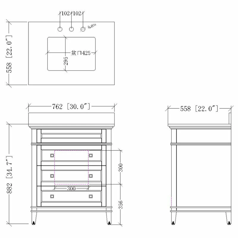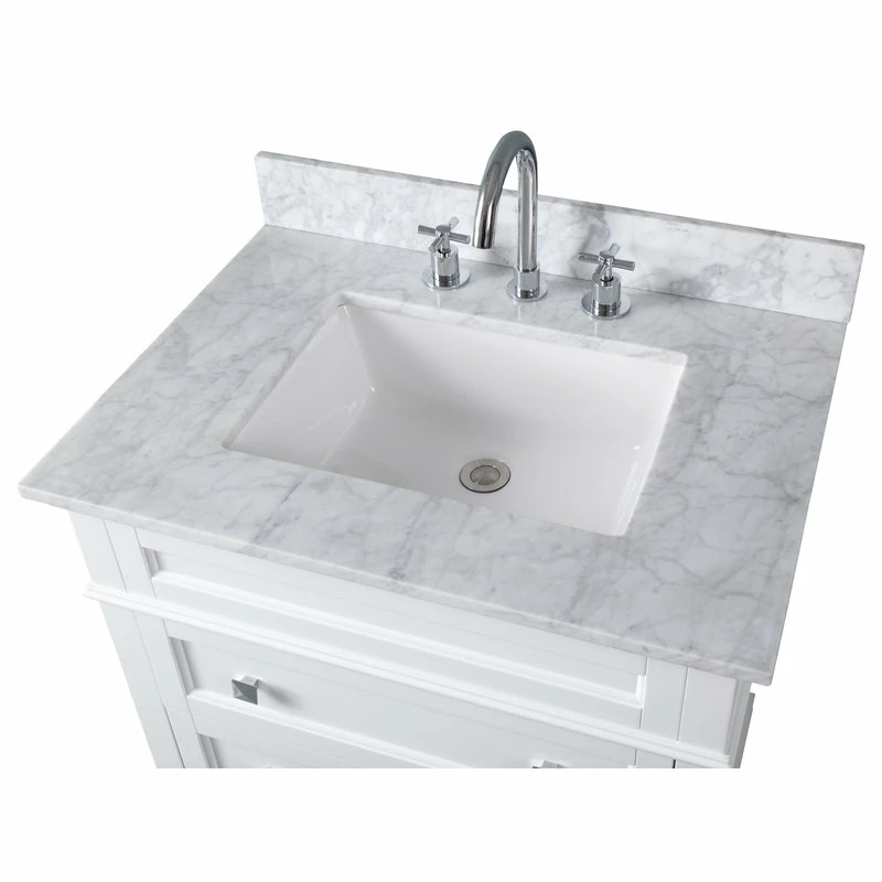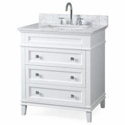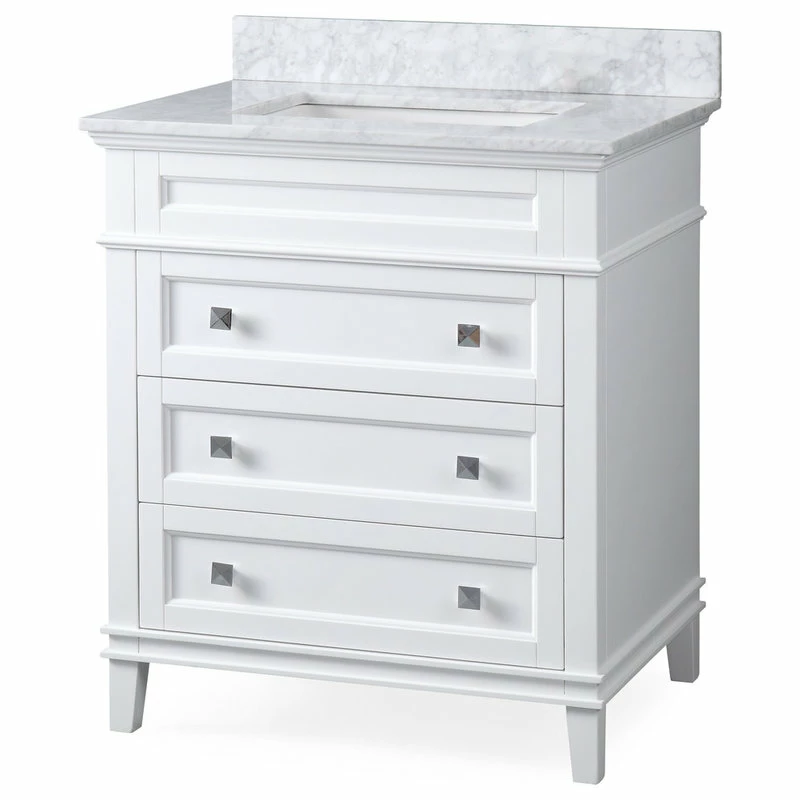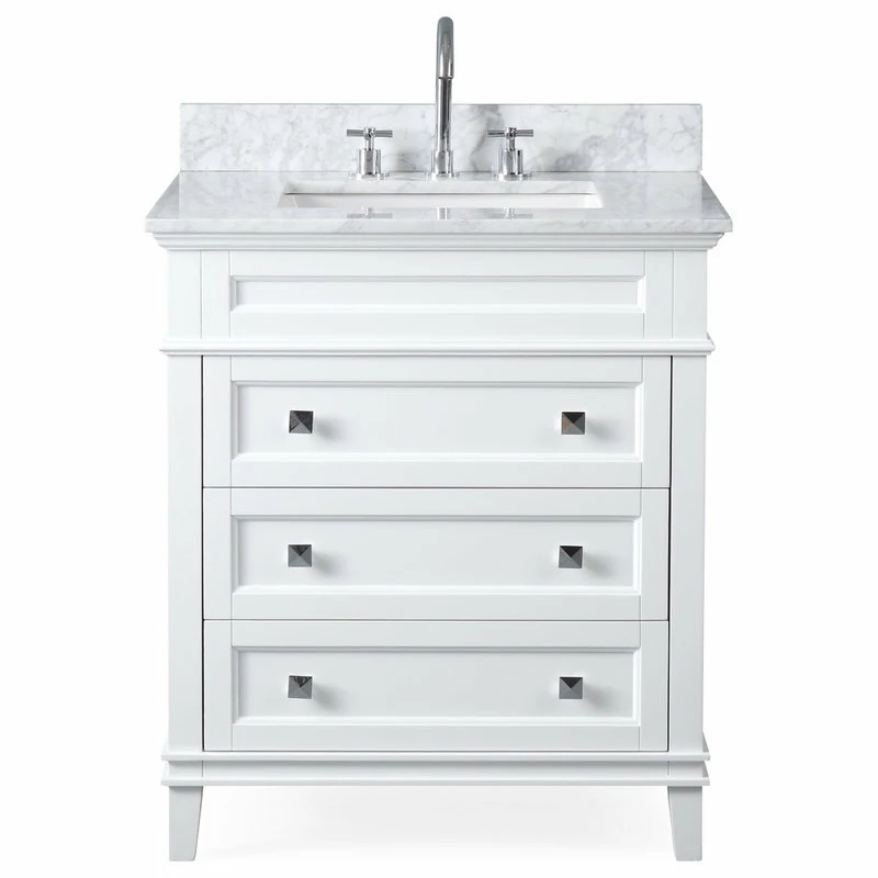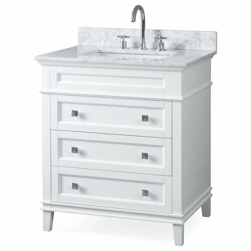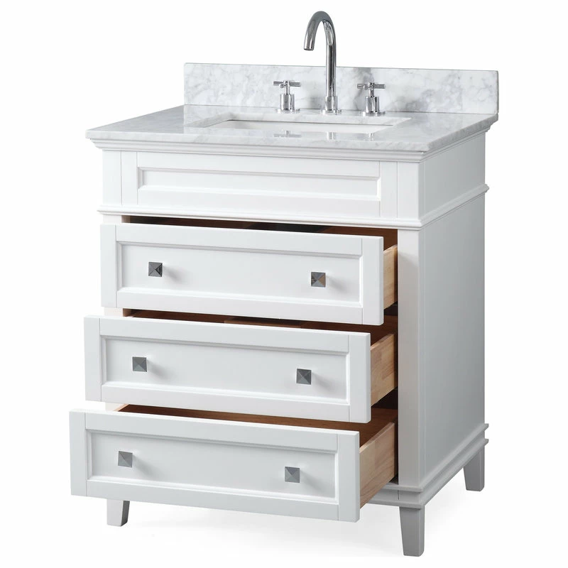 Featuring an elegant and simple bathroom sink vanity: Felix. This bathroom vanity is focused on design and functionality. Itβs a perfect piece to enhance modern or contemporary bathroom settings. This vanity is made of the finest select birch solids, high-end furniture-grade construction, made with 100% solid wood and plywood only. Italian Carrara marble countertops add elegance to the piece, all drawers are rubberwood with dovetail joints, soft closing mechanism. The 3 good sizes drawers provide plenty of storage space for towels or other necessities.