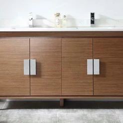 Tennant Brand Larvotto Light Wheat Finish Bathroom Sink Vanity will accent any bathroom. This striking design features 4 soft close doors, two shelves, chrome door handles, fairy white quartz countertop and two white ceramic sinks. This double sink modern bathroom vanity is made out of the finest select birchwood. Solid, high-end furniture-grade construction, made with 100% solid wood and plywood only.