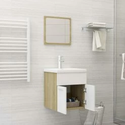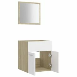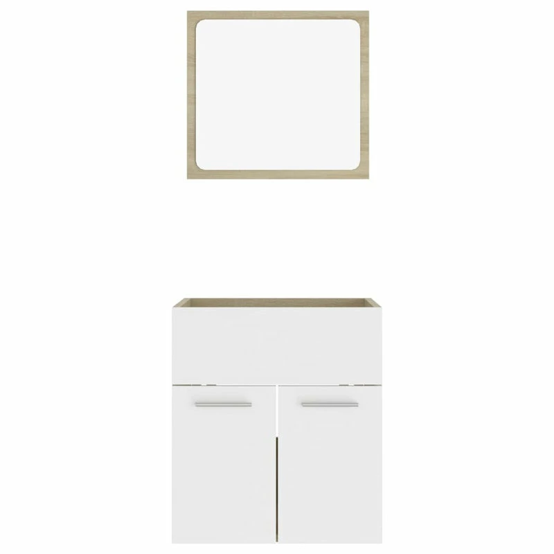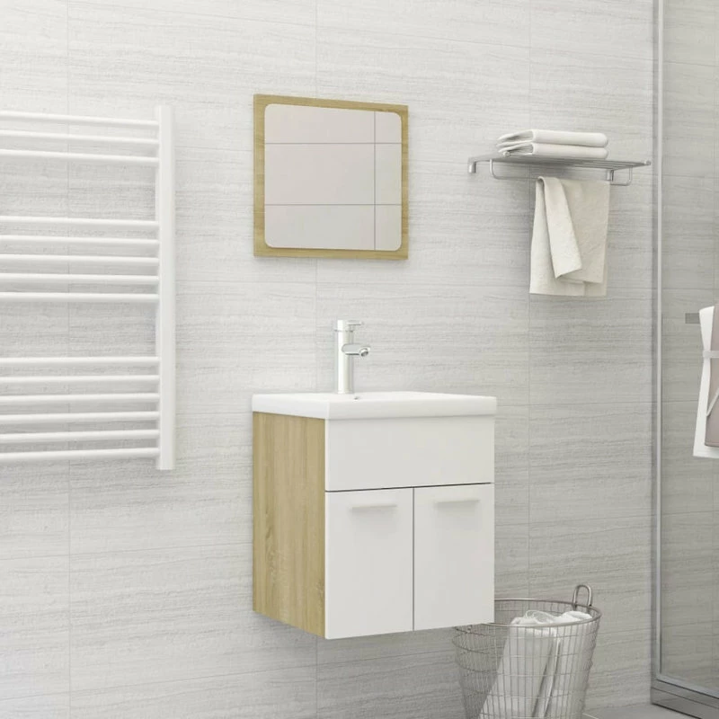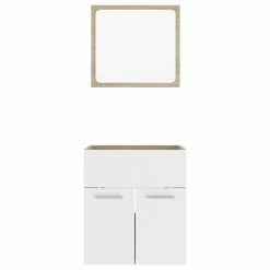With this stylish bathroom furniture set, you can create additional storage space for your bathroom with a striking, tidy appearance. The clean lines and sleek design blend into your bathroom perfectly. The furniture set, featuring a mirror and a cabinet, is made of durable and stable engineered wood. This chic cabinet features 1 compartment and 2 doors, offering ample storage space to store items in your bathroom. The top of the cabinet is ideal for placing the sink. The mirror also adds an excellent appearance to your home decor. Additionally, this bathroom set is easy to clean with a damp cloth. Please note: The sink is not included in the delivery.