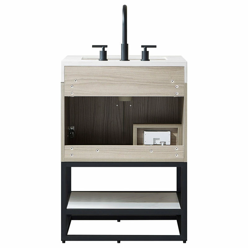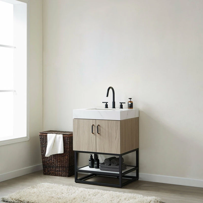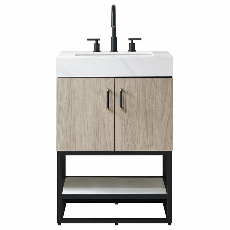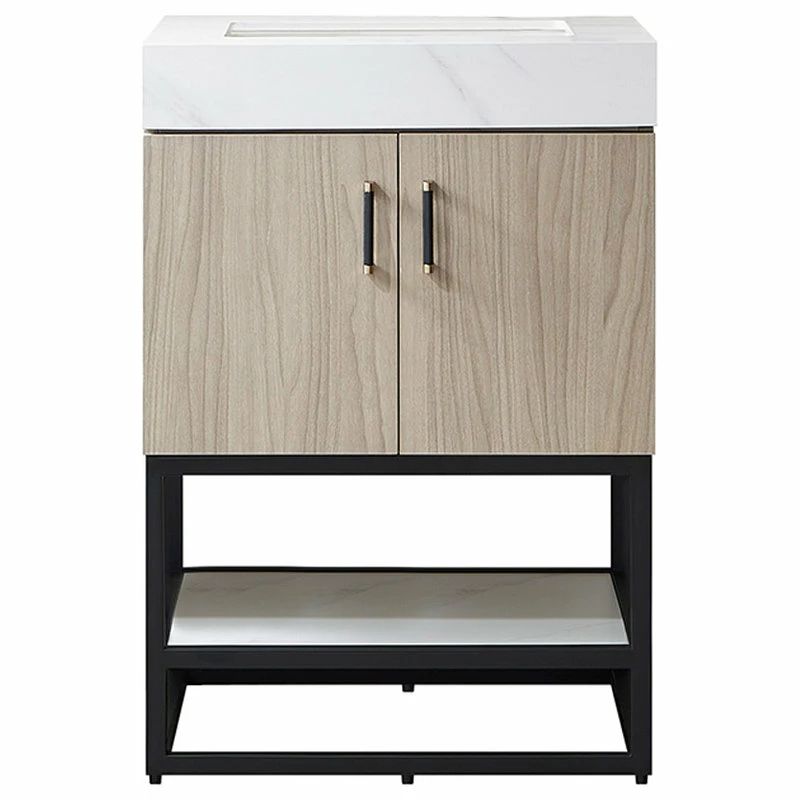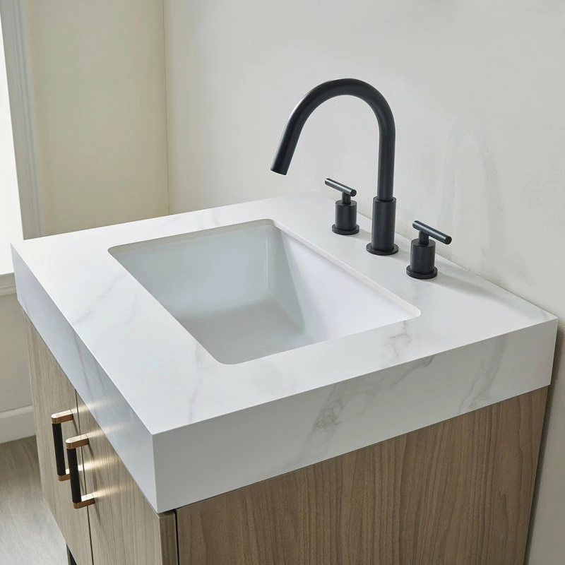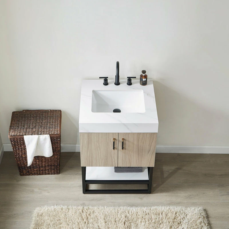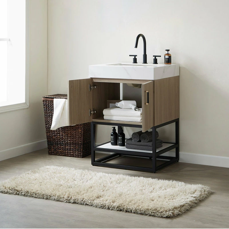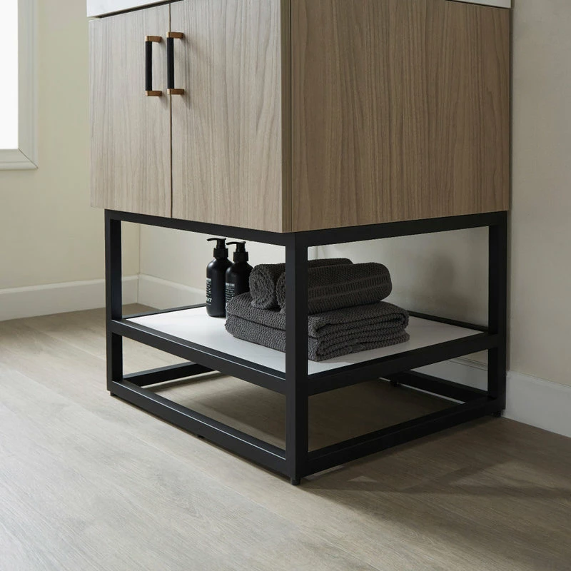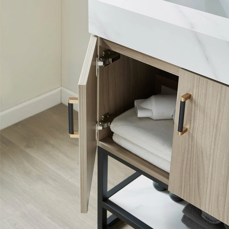 Toledo brings elegance and head-turning style to your modern bathroom space. The cabinets are made of Plywood and Technology moisture-proof board which can protect the beautiful vanity from water damage. Styled with high quality white sintered stone for a contemporary finish. Open shelving down below offers space for towels, toiletries, decorative items, and more. The option of brushed gold or matte black hardware compliments for a perfect opulent finish.
