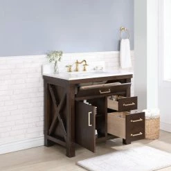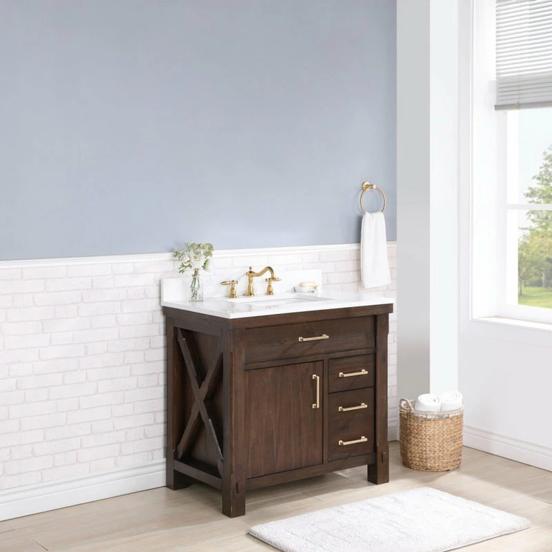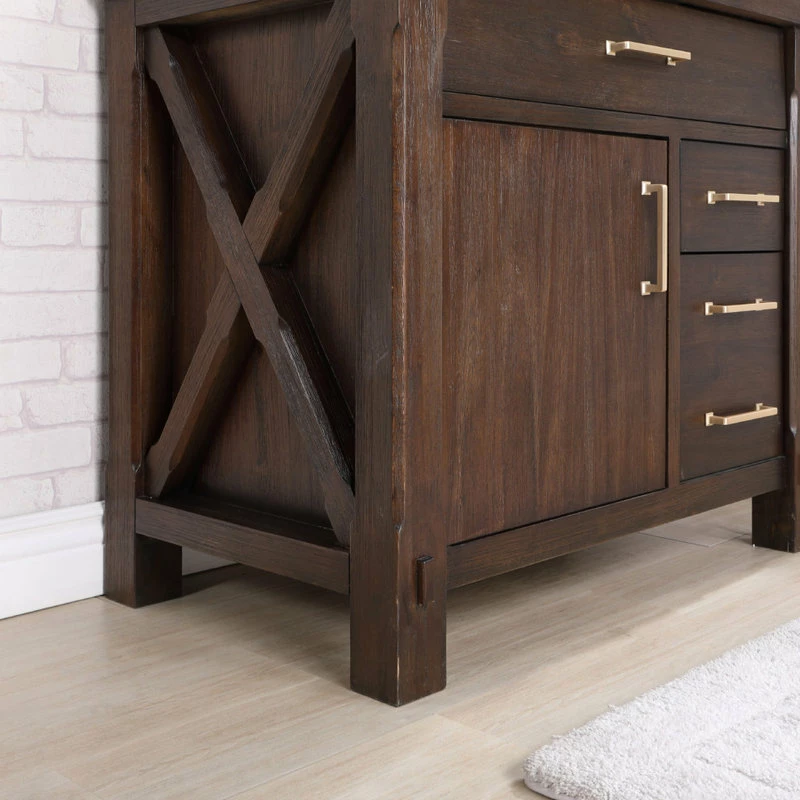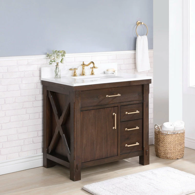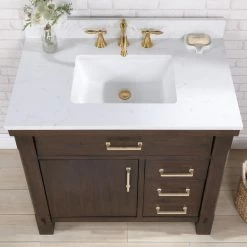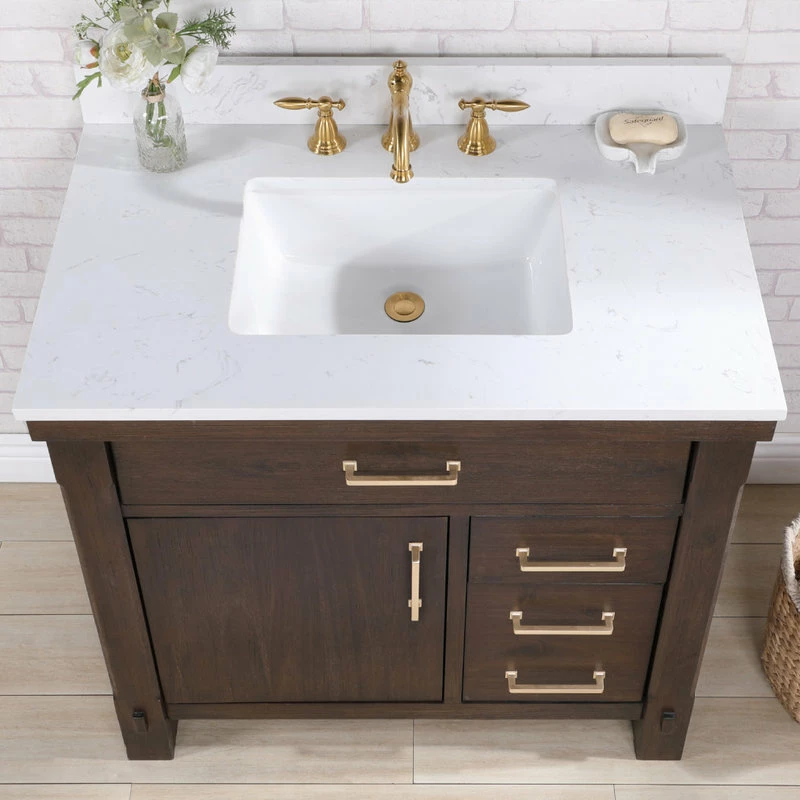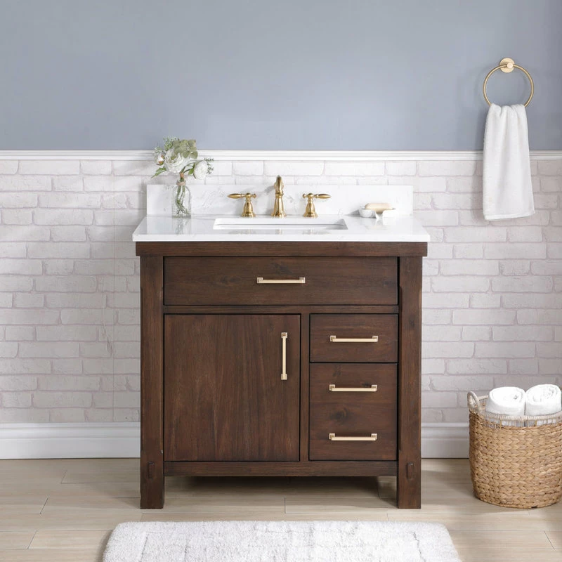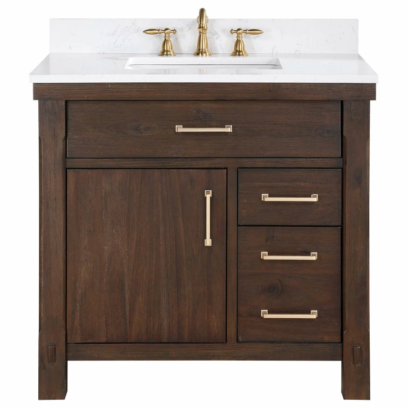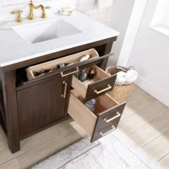 Exquisitely crafted from solid wood, the Viella Series vanity is a classic, handsome addition to your bathroom space. It embodies subtle elegance, with generous storage areas concealed by soft-closing drawers and doors. This piece is accented with a stylish white-stone countertop that contrasts beautifully with the richly colored cabinet.