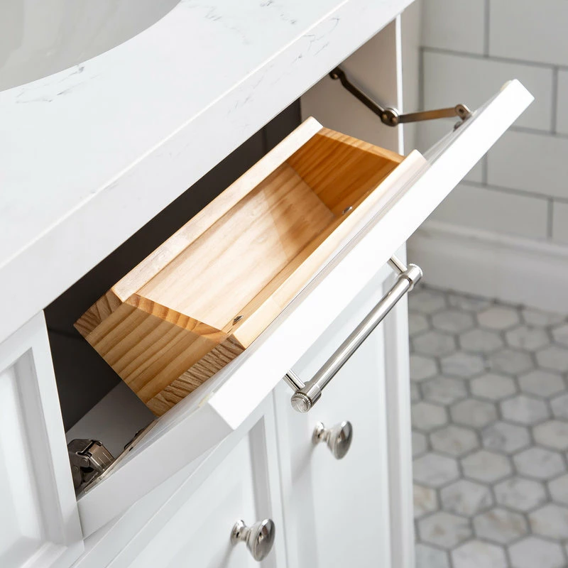 To come up with a great design idea for your bathroom, the vanity should be a premier element that is designed for your space, with ample storage and timeless details. Your bathroom is even more exciting as it incorporates a choice of three cabinet colors with elegant slim metal handles. With its empire palace inspired sense of style and contemporary design, the Palace bathroom vanity collection with its stunning white Quartz countertop attractively goes with the flow. Distinctive flip-out front panel design enhances the form and function. This distinguished bathroom vanity has a royal, regal character that makes you feel like the ruler of your new day.