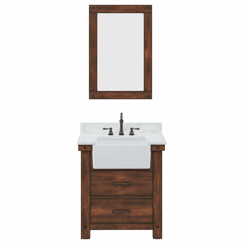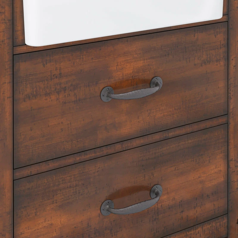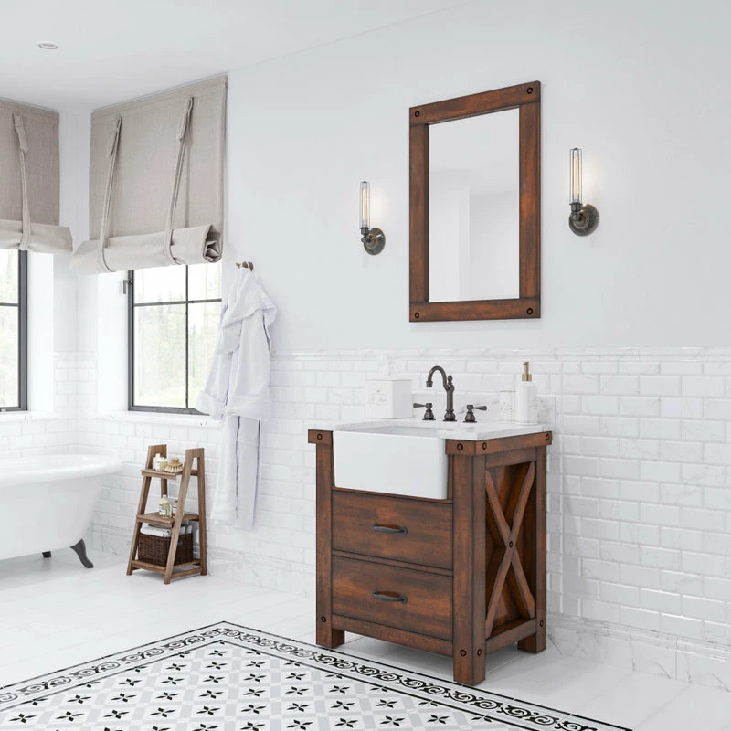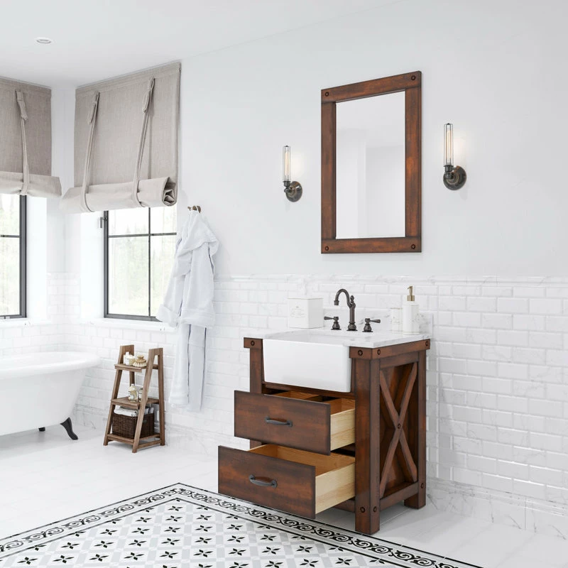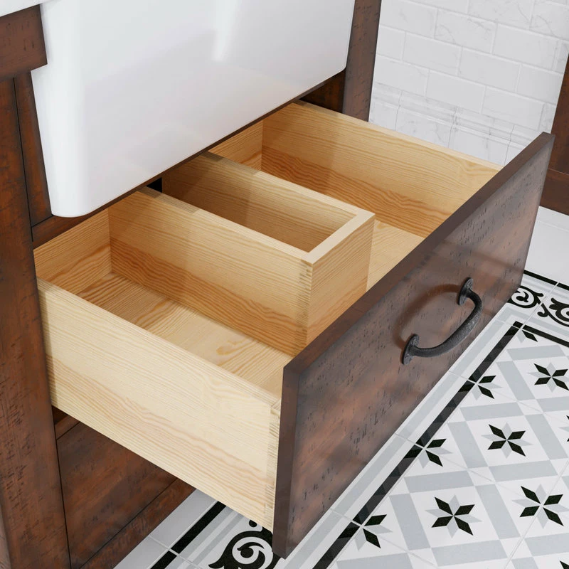 Ready yourself for a brand-new day in the versatility with barn style of the Paisley vanity collection. Inspired by nature, stellar color selection which includes grizzle gray or rustic sienna will satisfy your unique stylishness. Incorporated with superior craftsmanship, the X-Panels on both sides of the vanity are the epitome of modern farmhouse schemes. Its eye-catching style along with rustic aesthetic includes a spacious cabinet blended with antique wrought iron handles. The expertly crafted soft-closing drawers offer plenty of storage space for your bathroom essentials. Large ceramic apron sink bowl in snow white catches the center of attention, seamlessly complementing the soft glow of the vanity along with the Carrara White marble countertop. Paisley vanity collection is an excellent choice that combines the elegance of the past with a design that meets today’s needs.